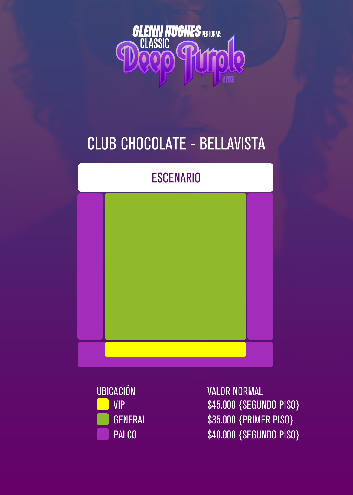 Los tickets se adquieren por sistema Passline.cl. Sin recargo en tiendas Mucky Rock (Eurocentro), Respect (Portal Lyon) y Bar de Nor (Viña del Mar). Más información en www.classicdeeppurplelive.cl y en Futuro.cl.
