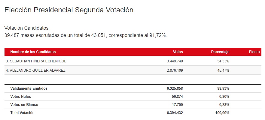 Con un 91,72% de las mesas escrutadas, Sebastián Piñera consolida su victoria en contra de Alejandro Guillier en la segunda vuelta de las elecciones presidenciales.