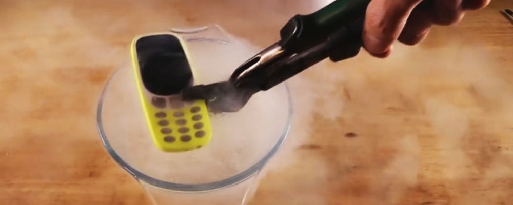 Para eso sumergieron el nuevo modelo 3310 en un recipiente con nitrógeno líquido. El nitrógeno puede alcanzar temperatura de -195,8° celsius, por lo que el teléfono quedará congelado en cosa de segundos.