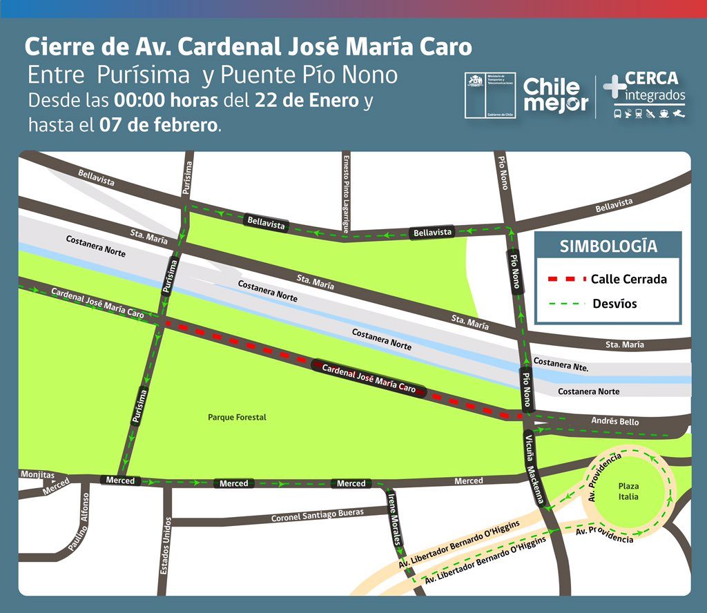 Según la infografía publicada por la entidad, quienes circulen de oriente a poniente deberán tomar la calle Pío Nono hacia el norte, seguir por Bellavista y volver a Cardenal Caro por Purísima.