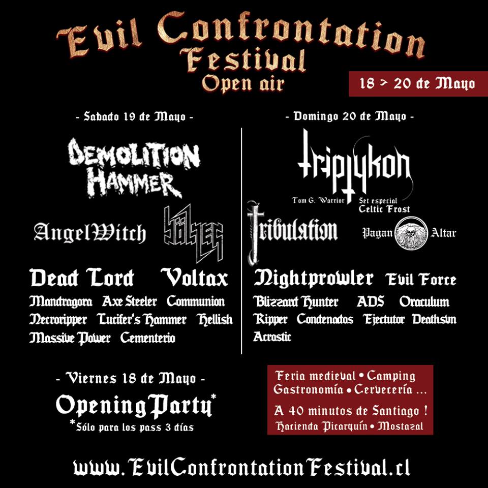 El festival Evil Confrontation Open Air, que se realizará el viernes 18, sábado 19 y domingo 20 de mayo, dio a conocer su distribución de bandas por día. Este es un evento internacional de metal, que reúne a 25 bandas, entre extranjeras y locales, y se hará en la Hacienda Picarquín de Mostazal, a 40 minutos de Santiago, con espacios para acampar y realizar diversas actividades.