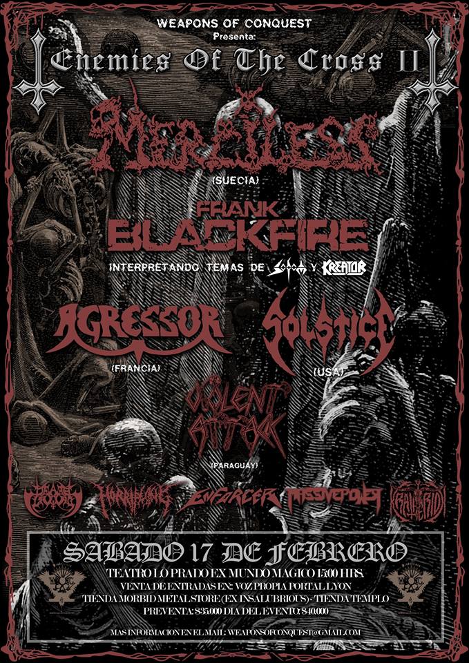 Una de las citas que se nos vienen este verano es el festival Enemies of the Cross 2, encuentro de metal internacional encabezado por los suecos Merciless, por primera vez en Chile, presentando los clásicos que le dieron un lugar en la escena death/thrash metal de principios de los 90, con producciones como su mítico debut «The awakening».