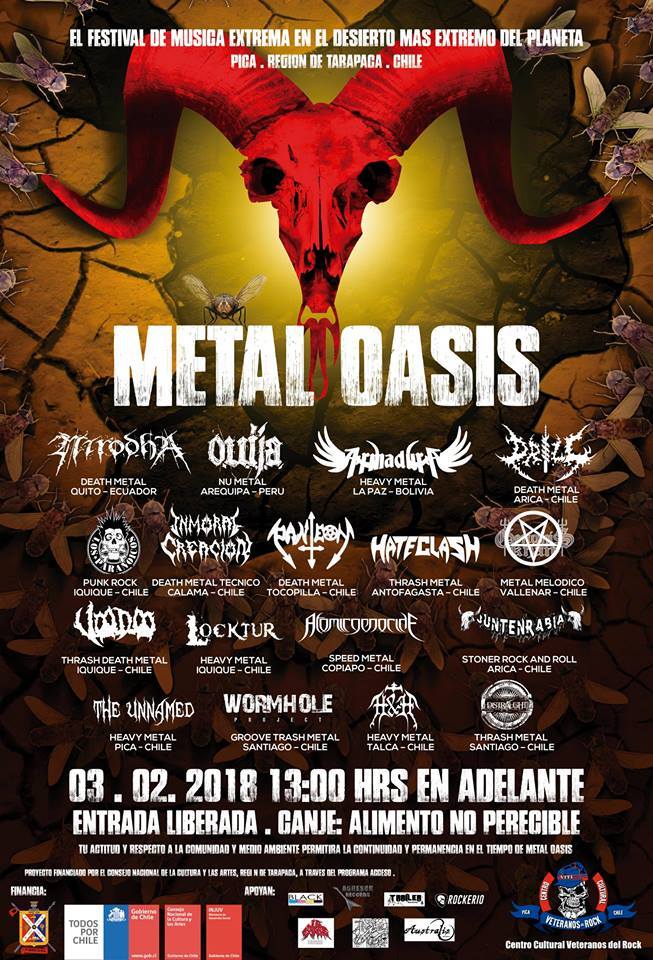 Para la gente que nos escucha más al norte de nuestro país, hay un interesante evento este fin de semana, llamado Metal Oasis, presentado como “el festival de música extrema en el desierto más extremo del planeta”. Se realiza en Pica, en la Región de Tarapacá, este sábado 3 de febrero desde las 13 hrs.