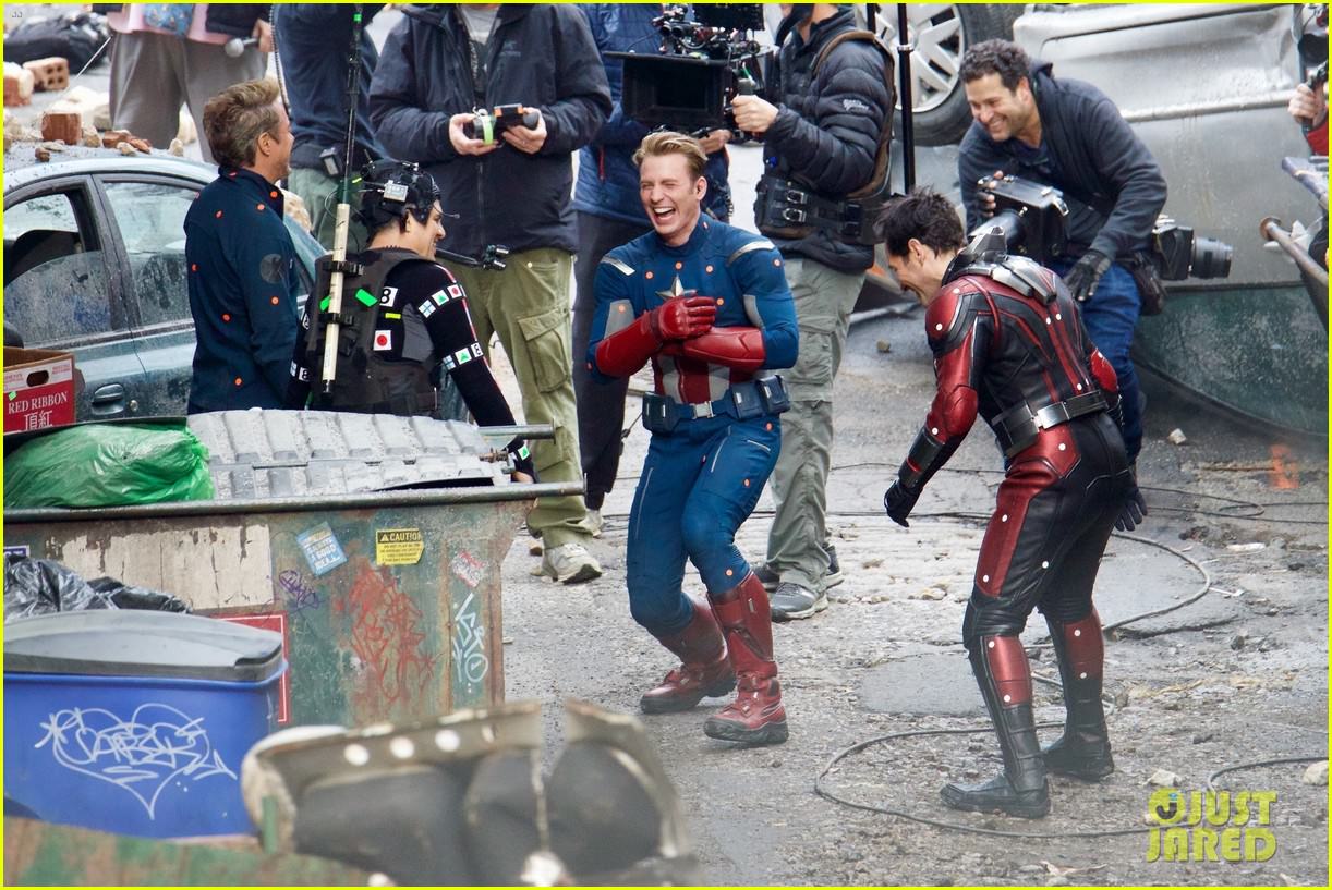 En ese contexto, han surgido imágenes que nos han presentado un viaje de regreso a los sucesos de la Batalla de Nueva York de la primera película de los vengadores, o el retorno de una locación ya destruida en Iron Man 3. Y esta semana, apareció una nueva serie de imágenes que recuperar al traje que el Capitán América (Chris Evans) utilizó en «The Avengers». Pero el punto más llamativo, además del hecho de que Rogers tiene una serie de puntos de captura de movimiento en su cuerpo, es que a su lado está Ant-Man (Paul Rudd), pero con su nuevo traje. En tanto, Tony Stark sigue portando un traje con un logo de S.H.I.E.L.D.