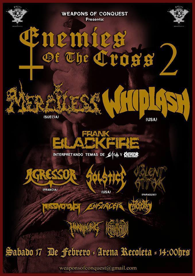 Hay novedades con el festival Enemies of the Cross 2, una jornada de metal internacional que se realizará el sábado 17 de febrero y viene encabezada por los suecos Merciless y los estadounidenses Whiplash.