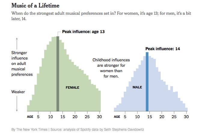 Nuestros gustos musicales están determinados por la música que más escuchamos durante nuestra adolescencia. En concreto, la edad media sería de 14 años para los hombres y 13 para las mujeres, según un estudio que comparte el The New York Times.