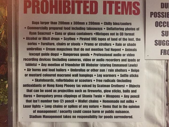 Como notaron varios fans durante el reciente paso de la banda de Dave Grohl por Auckland, Nueva Zelanda, Foo Fighters tiene una curiosa y bastante extensa lista de «objetos prohibidos» en sus conciertos.