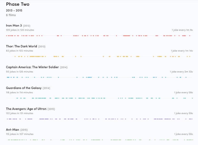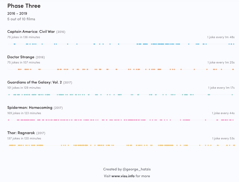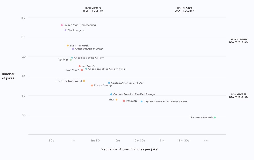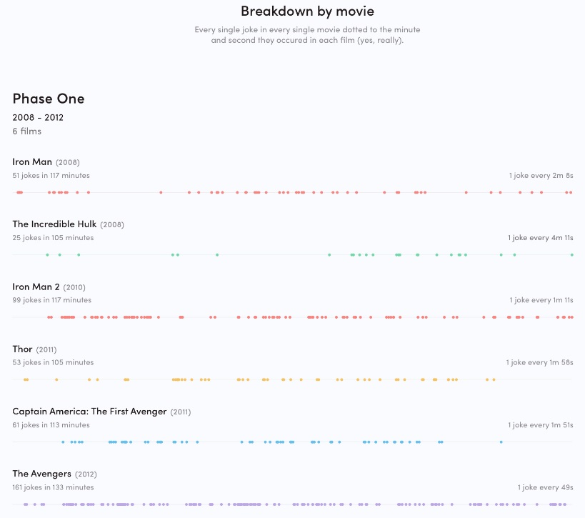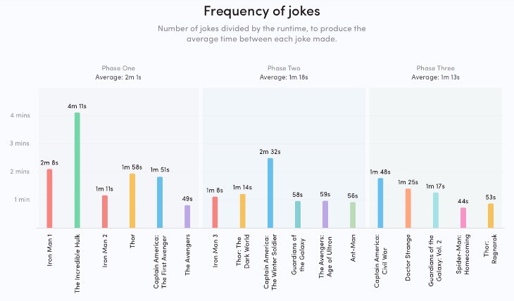 Es por esto que el fundador del blog visu.info realizó gráficos para mostrar la cantidad de chistes en cada película de Marvel, junto con la frecuencia en las que se presentan en la trama.