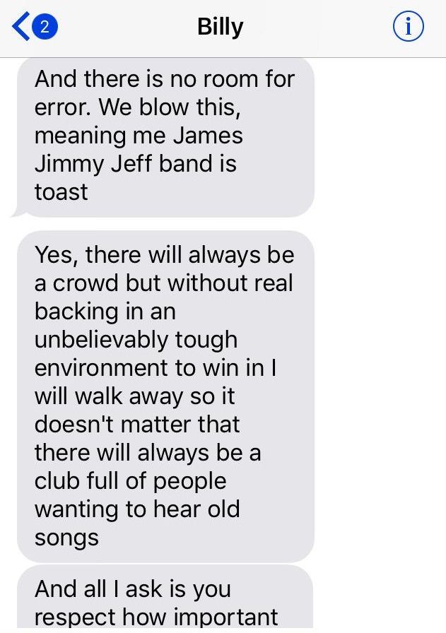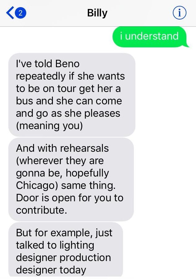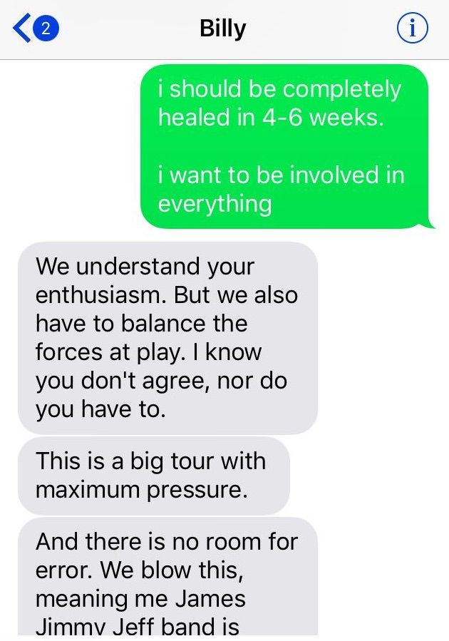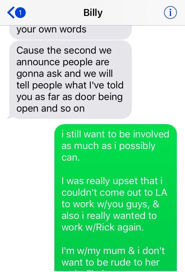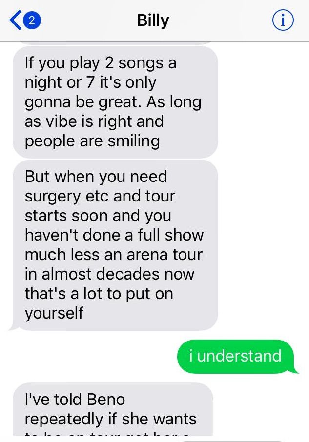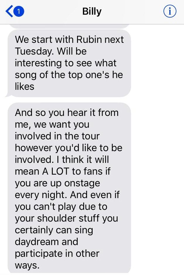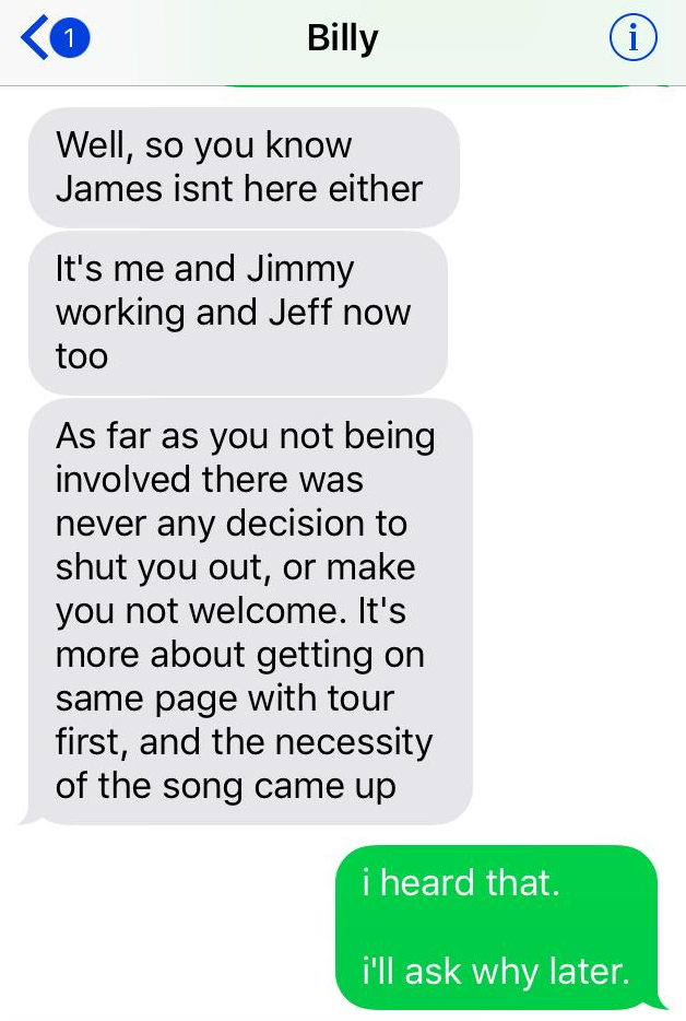 D’arcy compartió una serie de mensajes de texto en donde le reprochó a Corgan su comportamiento, y en los que además se ve que él le aseguró que tanto Chamberlin como Iha estaban de acuerdo en reunirse sin ella. “Intenté lo mejor para convencer a Billy de lo contrario… Le dije que estaba tirando algo precioso. A Él no le importa”, agregó.