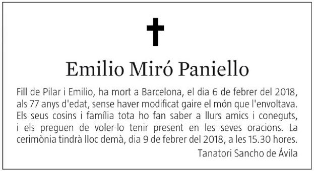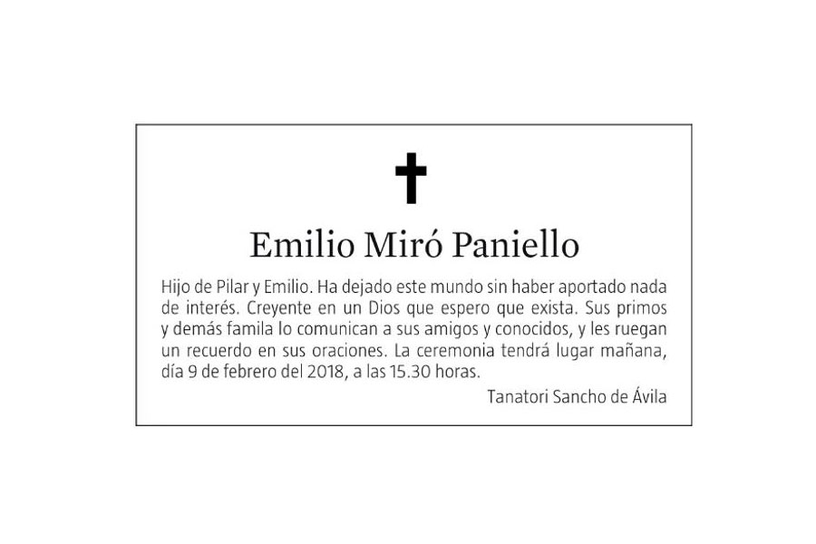 ACTITUD FUTURO Particular epitafio de un hombre que «Ha dejado este mundo sin haber aportado nada de interés” Por Hector Muñoz Tapia | 12 Feb, 2018. 07:04 hrs La publicación ya se ha hecho viral por lo frió del escrito. En el diario español La Vanguardia se publicó el pasado jueves un epitafio donde familiares se despedían de su primo que falleció a los 77 años en la ciudad de Barcelona. Lo llamativo de esto, fue la frialdad con la que redactaron el mensaje, el cual fue escrito en español y en catalán. Ante este mensaje, el periodista Albert Om del programa «Islandia» fue al funeral de Emilio Miró para poder encontrar alguna explicación de este particular obituario. La familia presente señaló que “el aviso fúnebre forma parte de un testamento en vida que dejó y lo descubrimos después de su muerte” y que “Era un hombre con una cultura muy elevada y también muy modesto, hizo muchas cosas, pero la esquela cuadra con su forma de ser”. Obituario Cosquin Rock aterriza en Chile - sábado 6 de octubre, Movistar Arena Ryan Reynolds saluda a Josh Brolin en su cumpleaños al estilo Deadpool Sigue a FUTURO.cl en Google Discover Recibe nuestros contenidos directamente en tu feed. Seguir en Google Contenido patrocinado