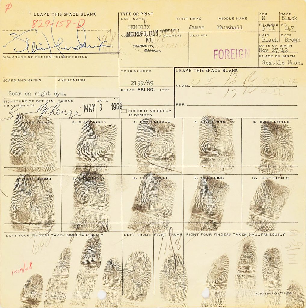 La tarjeta incluye el nombre completo de Hendrix, su dirección y sus 10 huellas dactilares, además de su firma y la mención de “cicatriz en su ojo derecho” como un detalle importante.