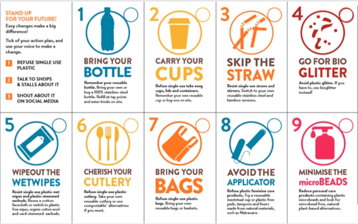 La iniciativa también elaboró una guía para asistentes en las que les recomienda llevar sus propias botellas, cubiertos y bolsas, usar tazas que se puedan volver a utilizar, prescindir de las pajitas, usar purpurina orgánica, renunciar a las toallitas y a los productos íntimos de plástico, tales como los tampones.