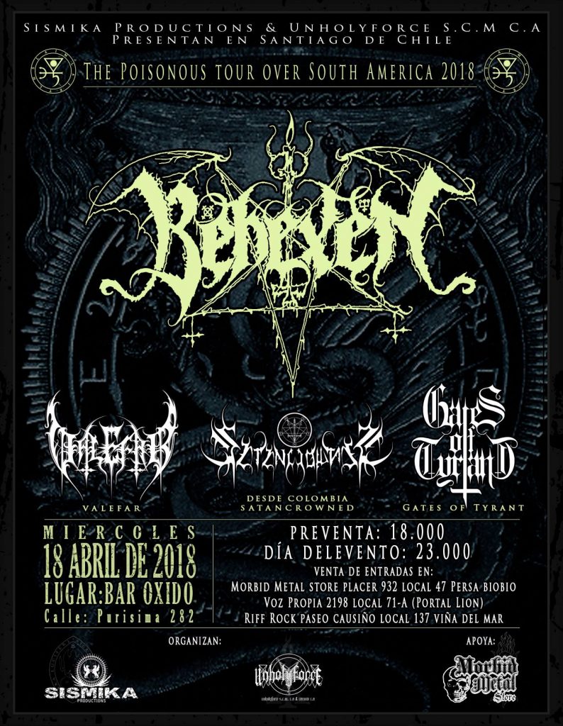 Noticias Behexen debuta en Chile – miércoles 18 de abril, Bar Óxido La banda findandesa llega con su gira The Poisonous Tour Over South America 2018. Por Hector Muñoz Tapia | 10 Abr, 2018. 15:38 hrs La banda findandesa llega con su gira The Poisonous Tour Over South America 2018. El próximo miércoles 18 de abril se presenta en Santiago el grupo Behexen, procedente de Finlandia, con su gira ‘The Poisonous Tour Over South America 2018’, que promociona su último disco «The Poisonous Path» del 2018. Van a estar en el bar Óxido, de calle Purísima #282, barrio Bellavista, con Satancrowned de Colombia, Valefar y Gates Of Tyrant como bandas invitadas. Las entradas para eld ebut de Behexen en Chile cuestan 18 mil pesos y las encuentras en tienda Voz Propia (Portal Lyon) y tienda Morbid Metal (Persa Bío Bío). Behexen Vader confirma su regreso a Chile con shows en Santiago, Temuco y Concepción Whitesnake anuncia "Flesh & Blood", su nuevo disco de estudio Sigue a FUTURO.cl en Google Discover Recibe nuestros contenidos directamente en tu feed. Seguir en Google Contenido patrocinado