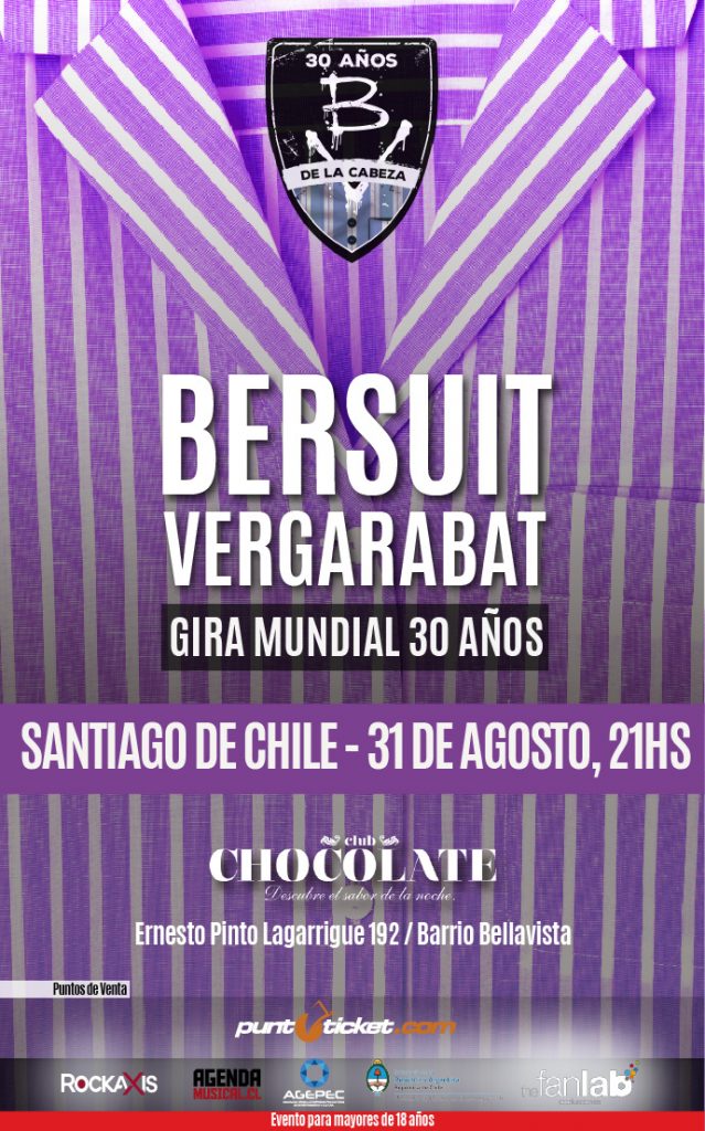 Sin categoría Bersuit Vergarabat vuelve a Chile para celebrar 30 años de trayectoria – viernes 31 de agosto, Club Chocolate Entradas en Puntoticket. Por Hector Muñoz Tapia | 26 Abr, 2018. 11:00 hrs Entradas en Puntoticket. Bersuit Vergarabat cumple 30 años y lo festeja junto a su público en una gira mundial que ya partió en Buenos Aires el 12 de abril y que hoy los tiene en México para seguir a España con 10 fechas, Alemania y luego en Moscú en la previa del partido inaugural de la selección Argentina en el mundial de fútbol. La legendaria banda argentina estará tocando en nuestro país el viernes 31 de agosto ene l Club Chocolate, en una noche donde repasarán todos los hitos de sus tres décadas de trayectoria. Las entradas estarán a la venta desde las 11 am del martes 2 de mayo en Puntoticket, con los siguientes precios y localidades: $22.000 General $35.000 VIP $45.000 Palco Bersuit Vergarabat Bruno Godoy de Sinergia protagoniza el cuarto capítulo de "High Fidelity - The Power Of Sound" "Star Wars Resistance": Lucasfilm anuncia nueva serie inspirada en el anime Sigue a FUTURO.cl en Google Discover Recibe nuestros contenidos directamente en tu feed. Seguir en Google Contenido patrocinado