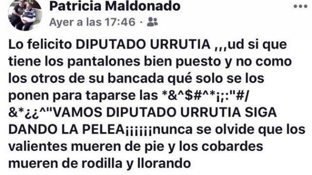 Maldonado, quien apoyó al «Sí» durante el plebiscito de 1989, había señalado en redes sociales: «Lo felicito diputado Urrutia, usted sí que tiene los pantalones bien puestos, y no como otros de su bancada que se los ponen para taparse las /&*&/#$&&!&. Vamos diputado Urrutia, siga dando la pelea. Nunca olvide que los valientes mueres de pie y los cobardes mueres de rodillas y llorando”.