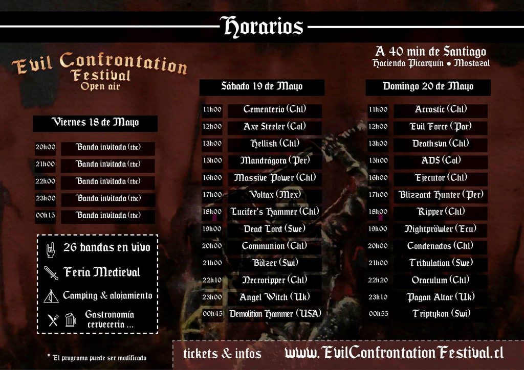 El festival Evil Confrontation Open Air, que será del 18 al 20 de mayo en la Hacienda Picarquín de Mostazal, con 26 bandas internacionales y nacionales del metal, reveló los horarios para sus tres jornadas.