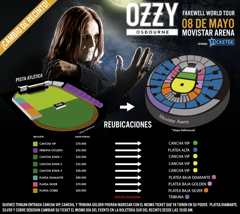 El concierto de Ozzy Osbourne agendado para el martes 08 de Mayo a las 21:15 hrs en la Pista Atlética del Estadio Nacional ha cambiado de recinto.