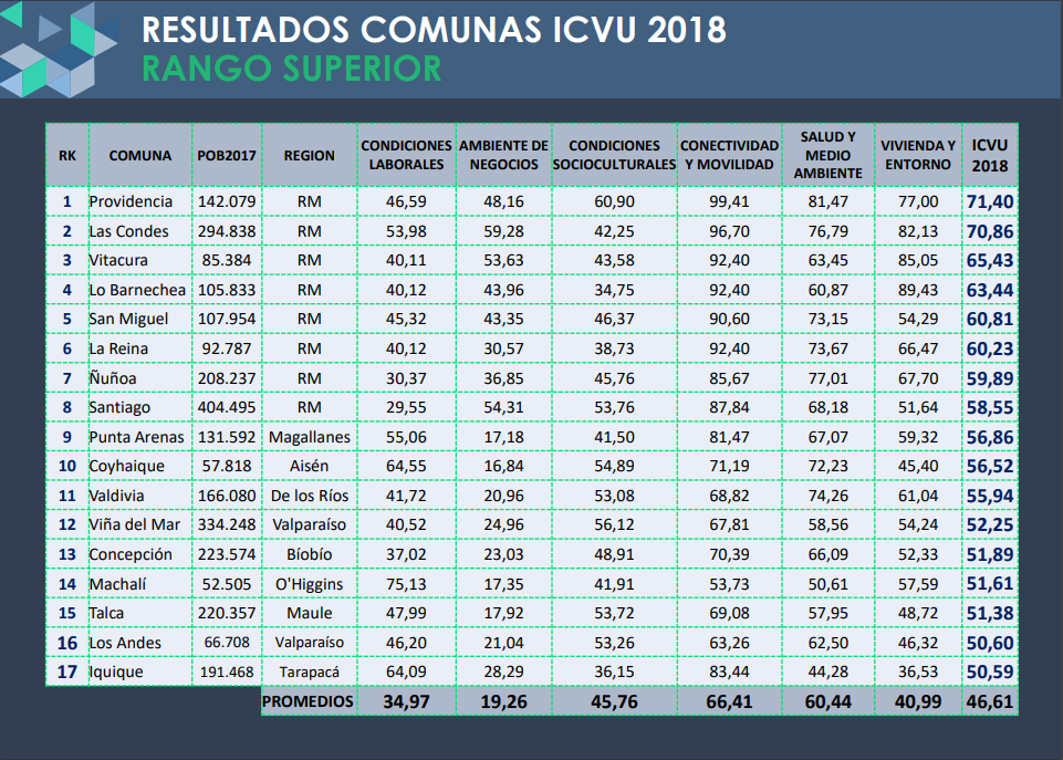 93 de las 346 comunas de nuestro país fueron parte del Índice de Calidad de Vida Urbana, el que concluyó que dentro de aquellas con mejor calidad de vida, ocho pertenecen a la Región Metropolitana, entre ellas Providencia, Las Condes y Vitacura. Inmediatamente en el noveno lugar, se encuentra Punta Arenas.