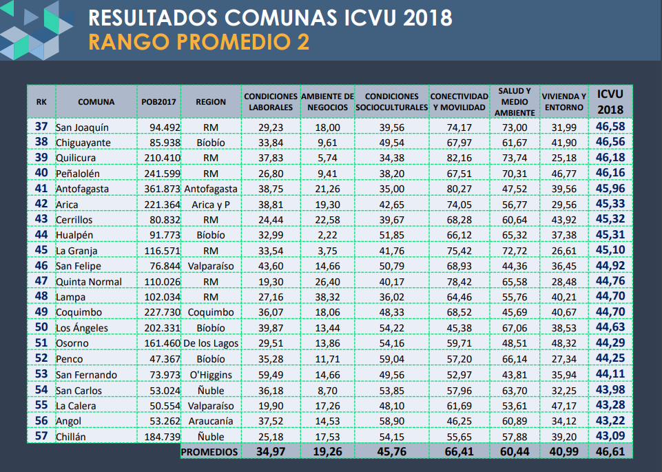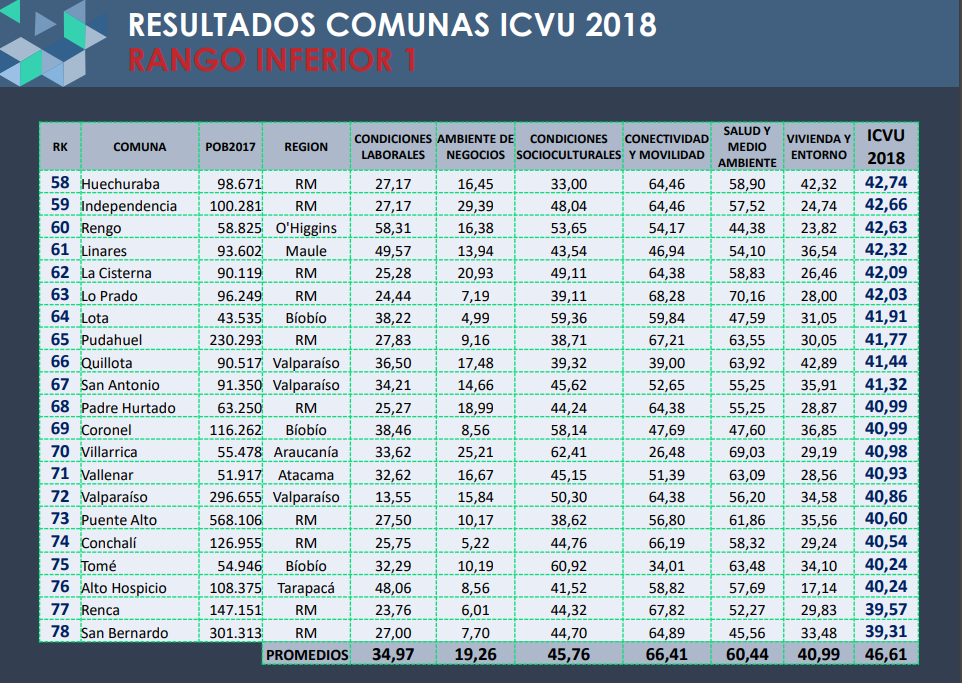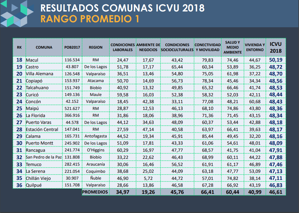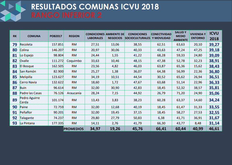 Por otro lado, Macul, Castro y Villa Alemana se encuentran en un «Rango Promedio». Distinto a las anteriores y en un «Rango Inferior», las comunas con peor calidad de vida son 36, entre las que destacan Alto Hospicio, Pudahuel y Valparaíso.