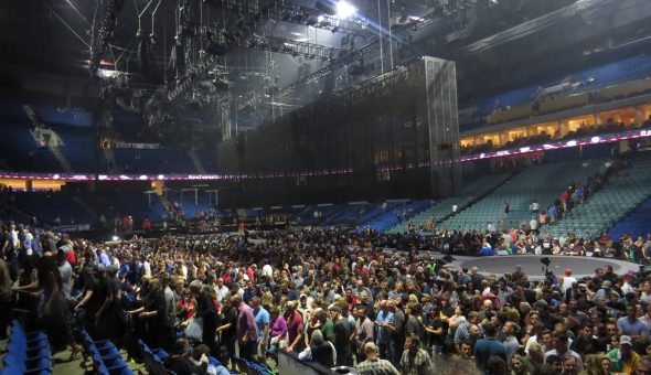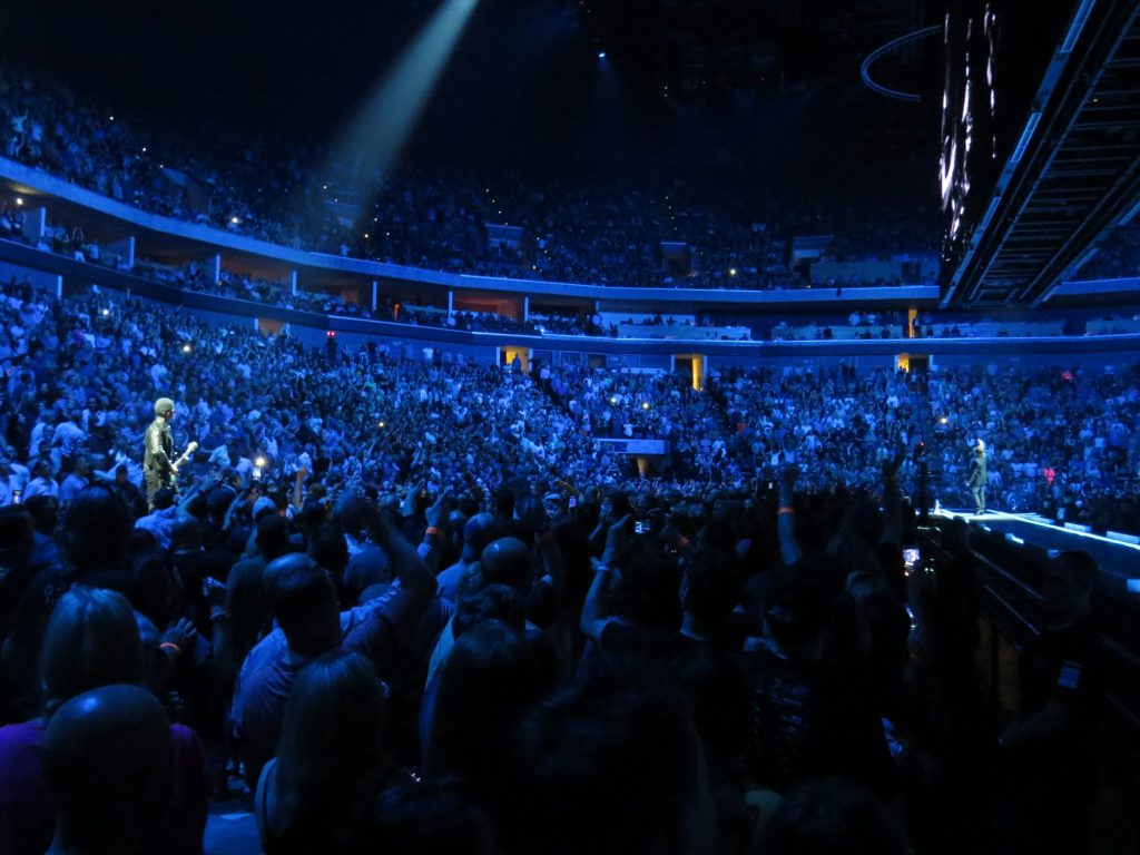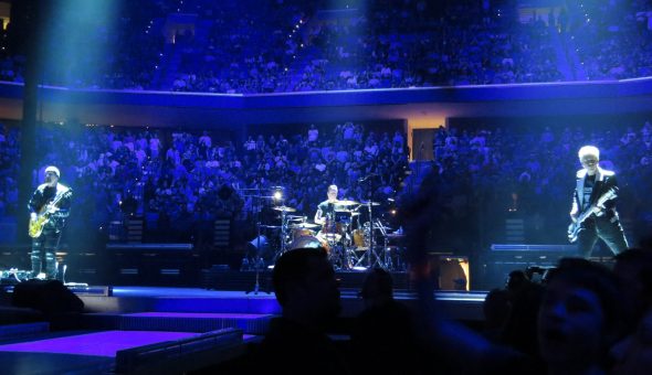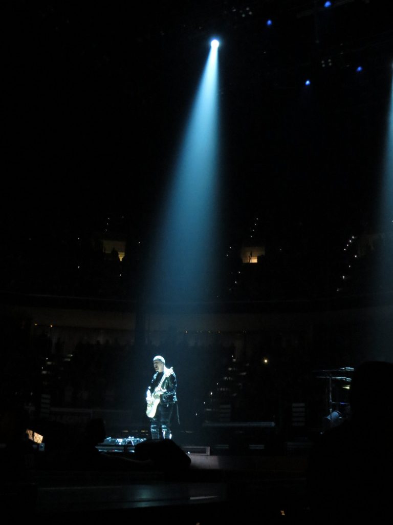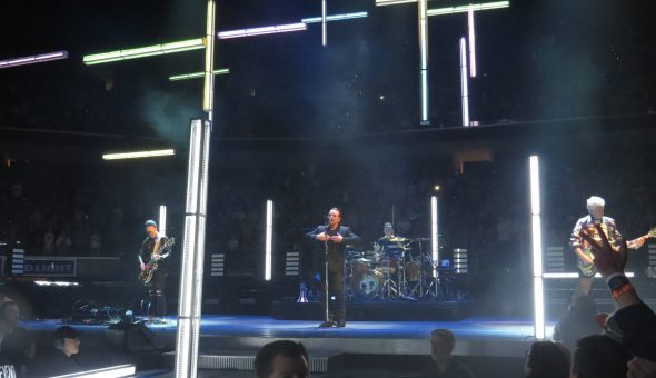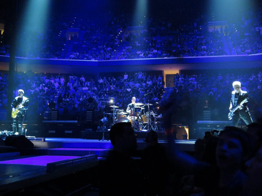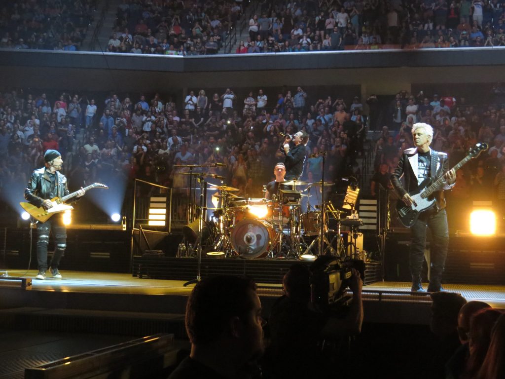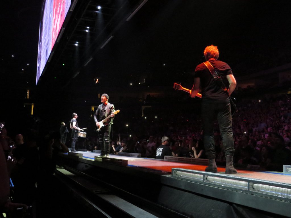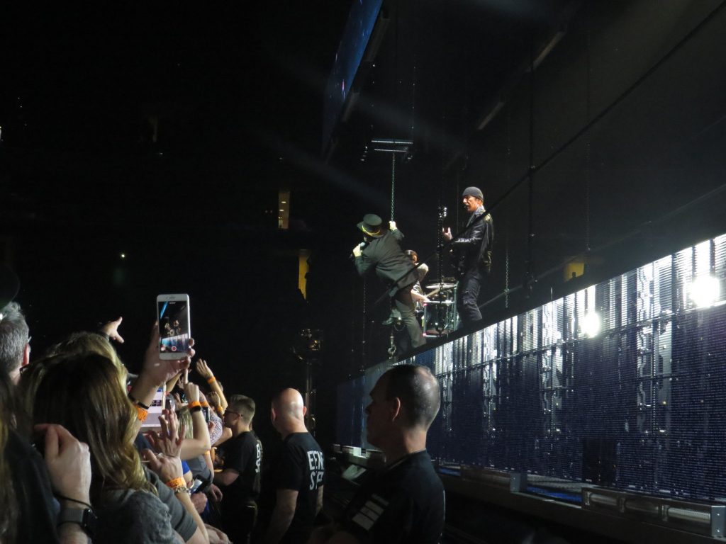 8:30 PM en punto y la música sube de volumen, las luces se apagan y la pantalla se transforma en un azul/celeste. Suena Bono, la pantalla se abre y él está adentro, sólo, sin micrófono, haciendo mímica de la primera canción de Songs Of Experience “Love Is All We Have Left”. Vuelve a cerrarse la pantalla y se va a negro todo. Comienza “The Blackout”, otra canción nueva mientras la pantalla se eleva, los fans de cancha pueden verse de un lado al otro de la pasarela y la música es oscura y pesada. La banda comienza ADENTRO DE LA PANTALLA y a mitad de canción se dejan ver para el estruendo de todo el BOK Center. ¡U2 ha vuelto y de qué forma! “Lights Of Home” (otra nueva) cierra ese comienzo rayando en la perfección, para ser seguida de “Beautiful Day”, “All Because Of You” (no tocada desde 2006) y “I Will Follow”. 6 al hilo que tumban a cualquiera.