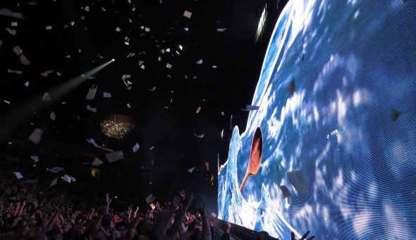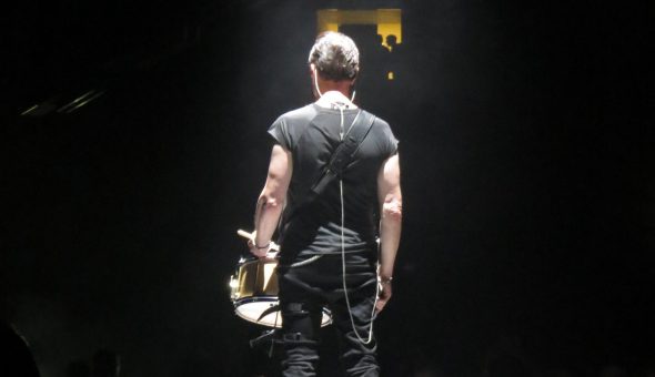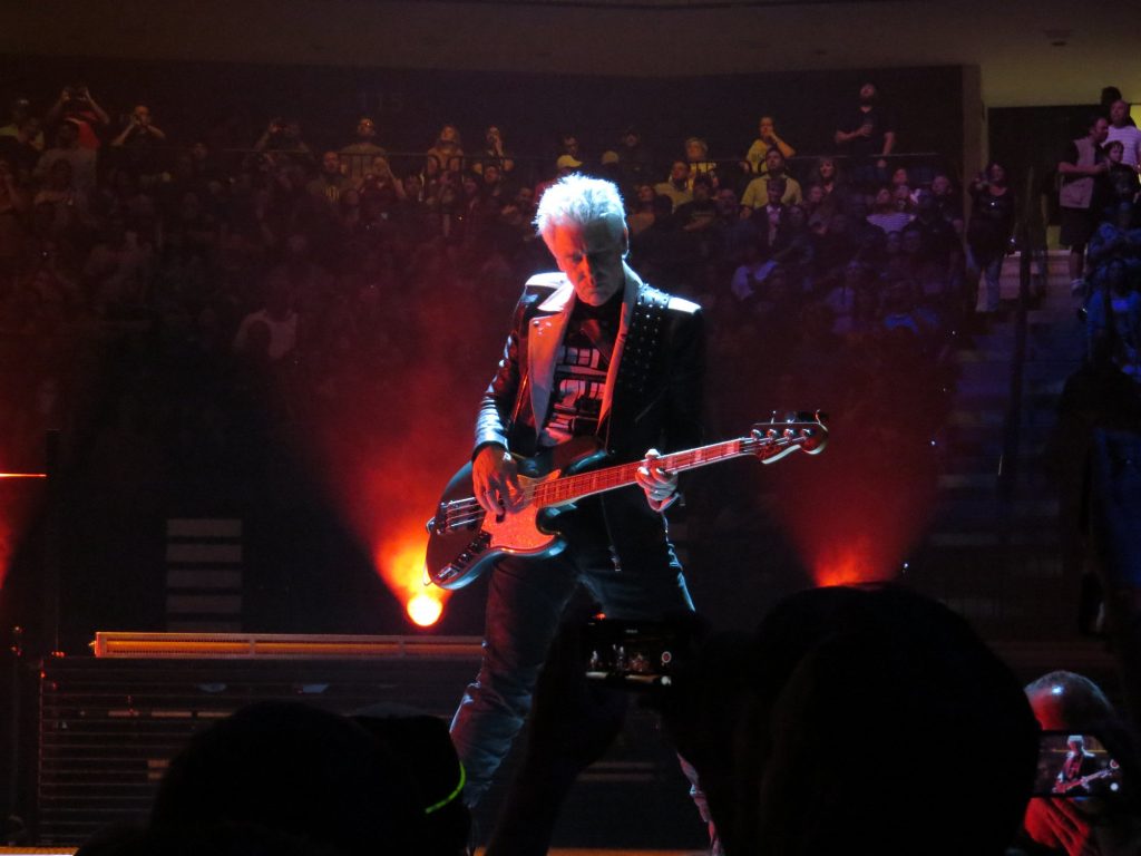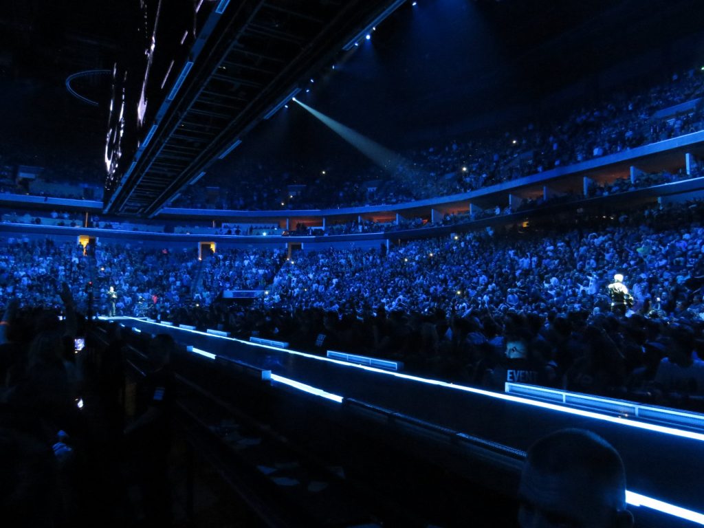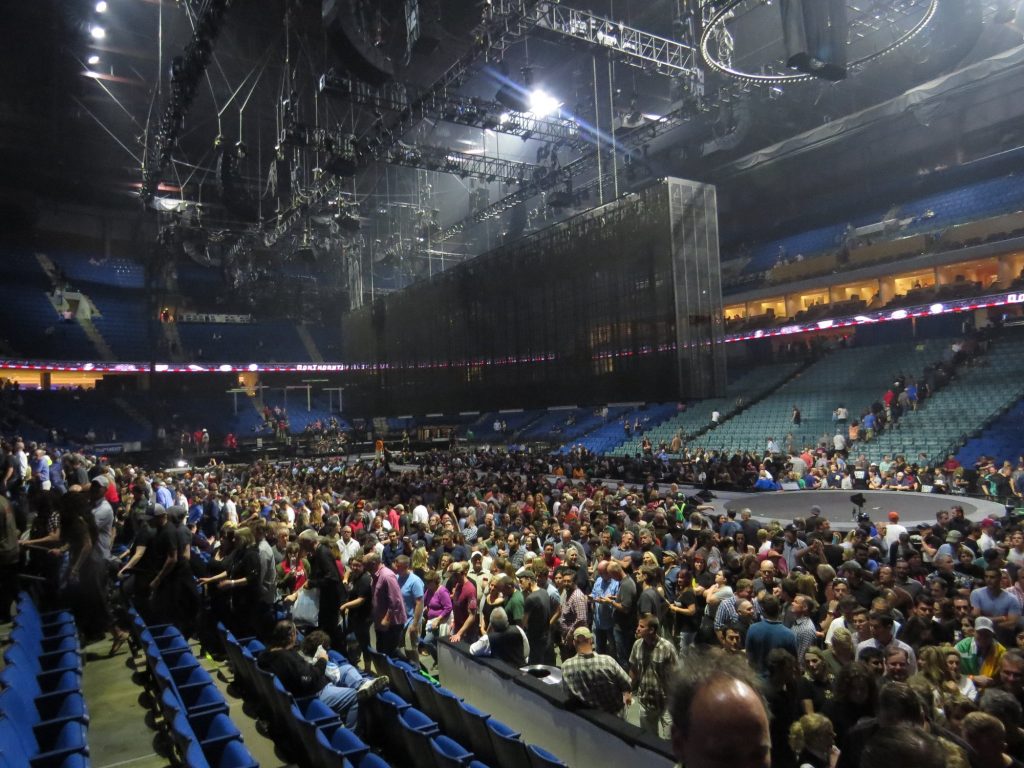 Llega la hora de entrar y el escenario es básicamente el mismo del 2015: un escenario principal (pequeño, tipo Pearl Jam en el Movistar Arena) + un escenario circular más pequeño al otro lado de la arena, conectados por una pasarela. Sobre ésta, una pantalla gigante que parece una jaula hecha de LEDs.