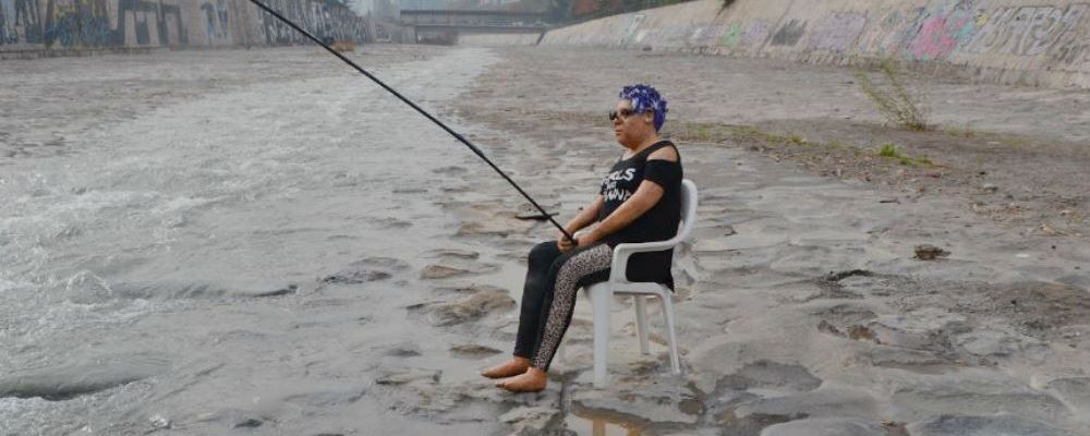 “Forever Vaca’s”, se llama la intervención y que tuvo este lunes a un muñeco que simulaba ser Maldonado pescando en el río Mapocho.