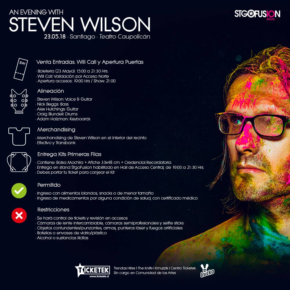 Noticias Steven Wilson en Chile – horarios y recomendaciones Por Hector Muñoz Tapia | 23 May, 2018. 11:23 hrs La cita es esta noche, en el Teatro Caupolicán. Esta noche, Steven Wilson toca nuevamente en Chile, esta vez presentando su más reciente disco, el aplaudido «To The Bone» ante un repleto Teatro Caupolicán. Y previo a la cita con el músico británico, la producción a cargo liberó información respecto a los horarios y las recomendaciones para el concierto, con las 19 hrs como la hora de apertura de puertas y las 21 hrs para el inicio del show. Revisa los horarios y recomendaciones para el show de Steven Wilson de esta noche en el teatro Caupolicán a continuación…ç Steven Wilson Teatro Caupolicán Nazareth anuncia un nuevo disco de estudio Burton Cummings de The Guess Who sufrió un accidente automovolístico Sigue a FUTURO.cl en Google Discover Recibe nuestros contenidos directamente en tu feed. Seguir en Google Contenido patrocinado