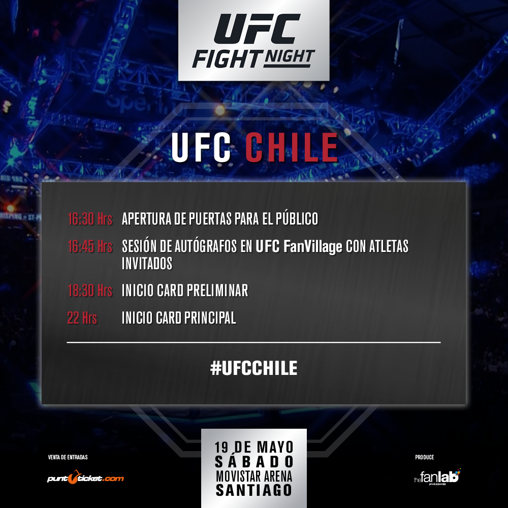 UFC es la competencia de Artes Marciales Mixtas más importante del mundo. Es también la marca mundial de deportes premium y el proveedor de Pay-Per-View más grande. En la conmemoración de su 25 aniversario este 2018 llega por primera vez a Chile este sábado 19 de mayo al Movistar Arena, con un set de peleas de lujo, una cartelera llena de estrellas y atletas locales.