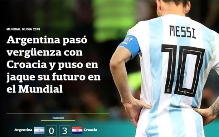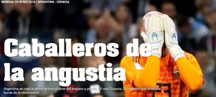 ACTITUD FUTURO «Caballeros de la angustia»: Medios argentinos criticaron con dureza la caída ante Croacia Desde "catástrofe" hasta "vergüenza" tildó la prensa lo ocurrido en el Mundial. Por Hector Muñoz Tapia | 21 Jun, 2018. 16:31 hrs Desde «catástrofe» hasta «vergüenza» tildó la prensa lo ocurrido en el Mundial. Por ADN.cl La caída de Argentina frente a Croacia prendió aún más las críticas de la prensa trasandina en contra de la selección y Jorge Sampaoli. Uno de los más duros fue Olé, que tituló «Caballeros de la angustia», a raíz del grosero error de Willy Caballero y que permitió la apertura de la cuenta. En tanto, Clarín tildó como «catátrofe» lo ocurrido frente a los croatas, recalcando que está a un paso de la eliminación. Por su parte, La Nación manifestó que la Albiceleste pasó una vergüenza frente a los balcánicos, manifestando que puso en jaque su futuro. Argentina croacia Mundial Rusia 2018 CONCURSO // Futuro te invita a la avant premiere de "¡Te Atrapé!" Diego Maradona las sufrió todas en el partido de Argentina ante Croacia Sigue a FUTURO.cl en Google Discover Recibe nuestros contenidos directamente en tu feed. Seguir en Google Contenido patrocinado