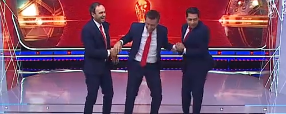 Cuando los rostros del área deportiva del canal, Rodrigo Herrera, Rodrigo Sepúlveda y Fernando Solabarrieta comenzaron a improvisar un baile al estilo ruso, Solabarrieta cayó sentado y terminó hasta con los pies en el aire, ahí y entre medio de risas sus compañeros lo ayudaron a levantarse.