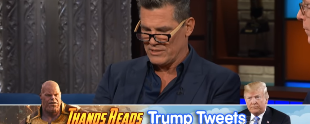 Josh Brolin, actor a cargo de Thanos apareció en el Late Show de Stephen Colbert para promocionar su cinta «Sicaro: Day of the Soldado», pero mientras estaba alli, Colbert le pidió un favor. Esta petición consistía en leer varios tweets del Presidente Trump en la voz de Thanos. Y aunque no tenía el look morado del villano, de todas manera logró una voz perfecta.