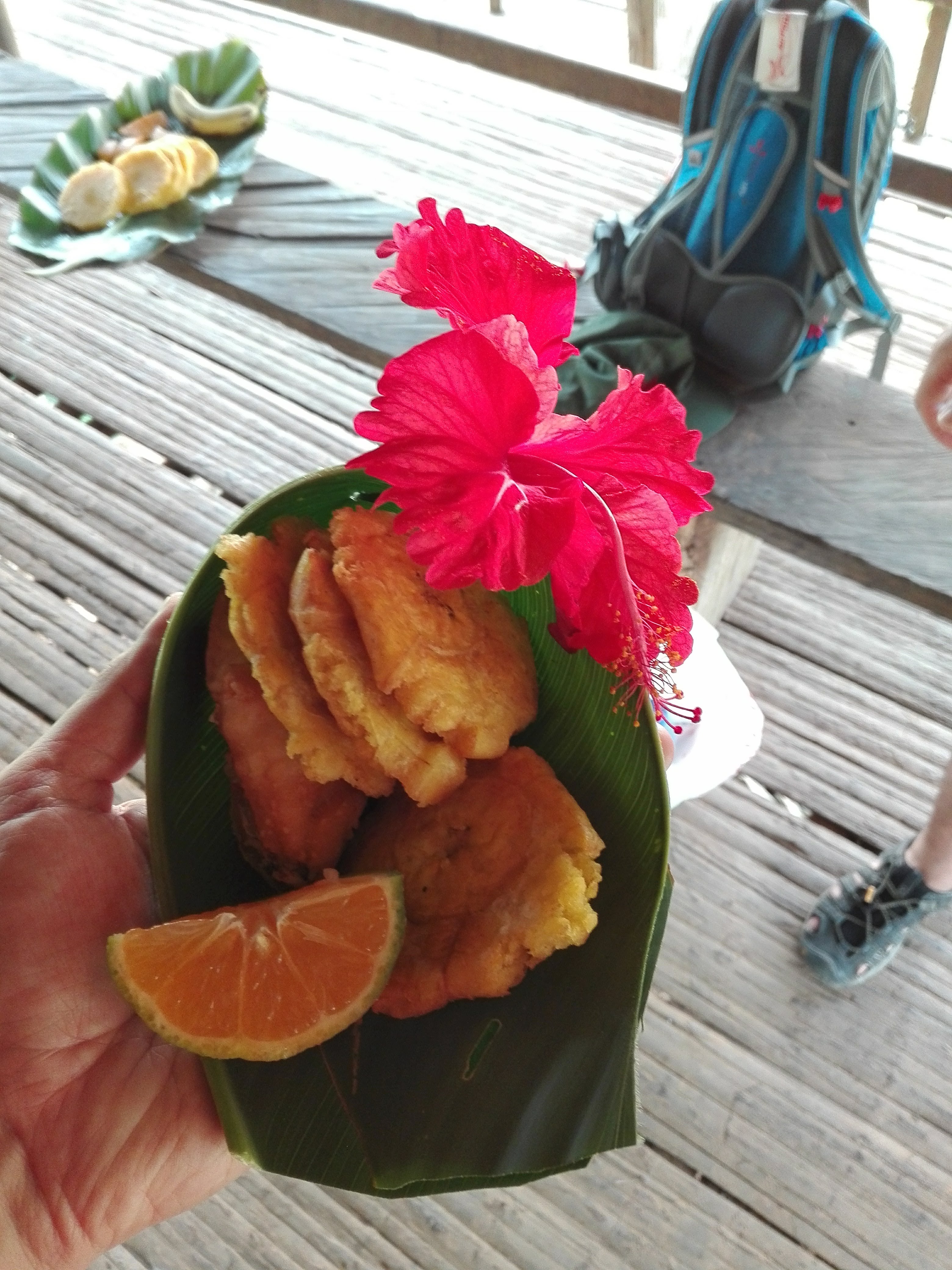 Después de la charla me invitaron a comer un pescado con plátano frito, todo envuelto en una hoja de plátano y una flor de hibisco, acompañado de un limón color naranja.