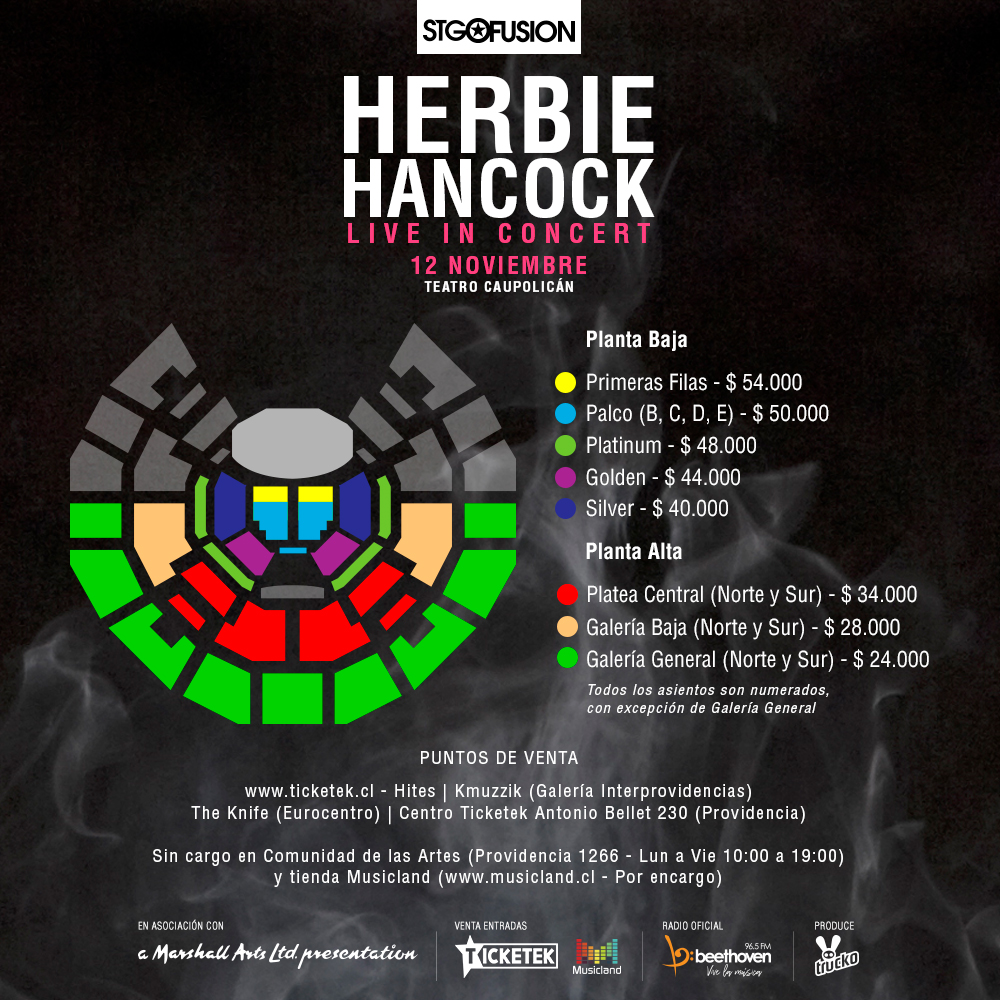 El reputado y legendario pianista y compositor, ha sido una parte integral de todos los movimientos de música popular desde 1960, ya sea como miembro del quinteto de Miles Davis, agrupación pionera del sonido innovador en el jazz, o como el responsable del desarrollo de nuevos enfoques en sus propias grabaciones, seguido de su trabajo en los años 70 – con álbumes récord como «Headhunters» – que combinaban el jazz eléctrico con el funk y el rock en un estilo transformador que continúa influyendo en la música contemporánea. «Rockit» y «Future Shock» marcaron la incursión de Hancock en los sonidos de la danza electrónica; durante el mismo período continuó trabajando en un entorno acústico con V.S.O.P., que incluía a los ex compañeros de banda de Miles Davis, Wayne Shorter, Ron Carter y Tony Williams.