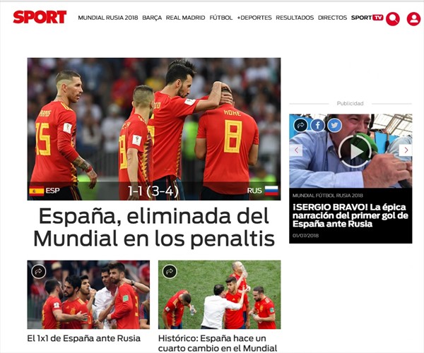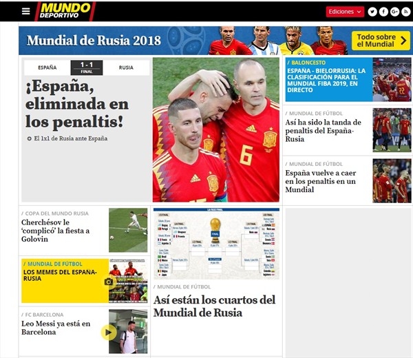 ACTITUD FUTURO La reacción de los medios hispanos tras eliminación de España en octavos de final ante Rusia "Otro chasco mundial", tituló el diario AS. Por Hector Muñoz Tapia | 01 Jul, 2018. 13:41 hrs «Otro chasco mundial», tituló el diario AS. Hoy, España quedó eliminada del Mundial tras caer por penales ante Rusia en los octavos de final disputados en el estadio Luzhniki. Los medios hispanos reaccionaron rápidamente al traspié de la «Roja» y lamentaron la partida del equipo de Fernando Hierro de Rusia. España Mundial Rusia 2018 Rusia Croacia derrota a Dinamarca por penales y se clasifica a cuartos ESPECIAL // Los memes de la eliminación de España en manos de Rusia en el Mundial Sigue a FUTURO.cl en Google Discover Recibe nuestros contenidos directamente en tu feed. Seguir en Google Contenido patrocinado