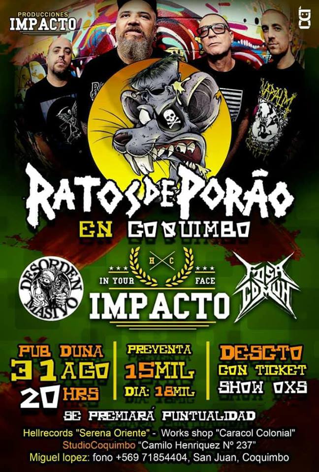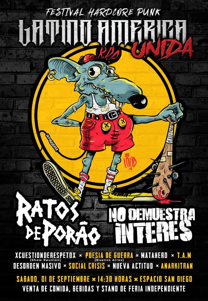 Noticias Ratos de Porao vuelve a Chile con fechas en Santiago y Coquimbo Por Jorge Lagas | 04 Jul, 2018. 14:17 hrs La banda brasileña Ratos de Porao vuelve a nuestro país, con dos fechas confirmadas, en Santiago y Coquimbo. En Coquimbo estarán el viernes 31 de agosto en el Pub Duna, con bandas nacionales, a $15.000 anticipada en tienda Hellrecords. Y en la capital estarán encabezando el festival hardcore punk Latinoamérica Unida, que es el sábado 1 de septiembre en el Espacio San Diego, con bandas como No Demuestra Interés y Matahero, entre otras. Entradas en Mucky Rock y Voz Propia a $10.000 las primeras. Más detalles, en los afiches más abajo. The Dwarves llega a Chile con Nick Oliveri en sus filas - Viernes 24 de agosto, Bar Loreto CONCURSO // Futuro te invita al Festival Stgo Music 2018 Sigue a FUTURO.cl en Google Discover Recibe nuestros contenidos directamente en tu feed. Seguir en Google Contenido patrocinado