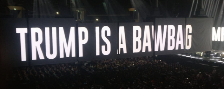 Durante el segundo de dos shows agendados en Glasgow, Waters usó un palabra propia de la lengua escocesa para mostrar su disconformidad con el POTUS. Sobre el escenario del Battersea Power Station, Roger proyectó: «Trump is a Bawbag».