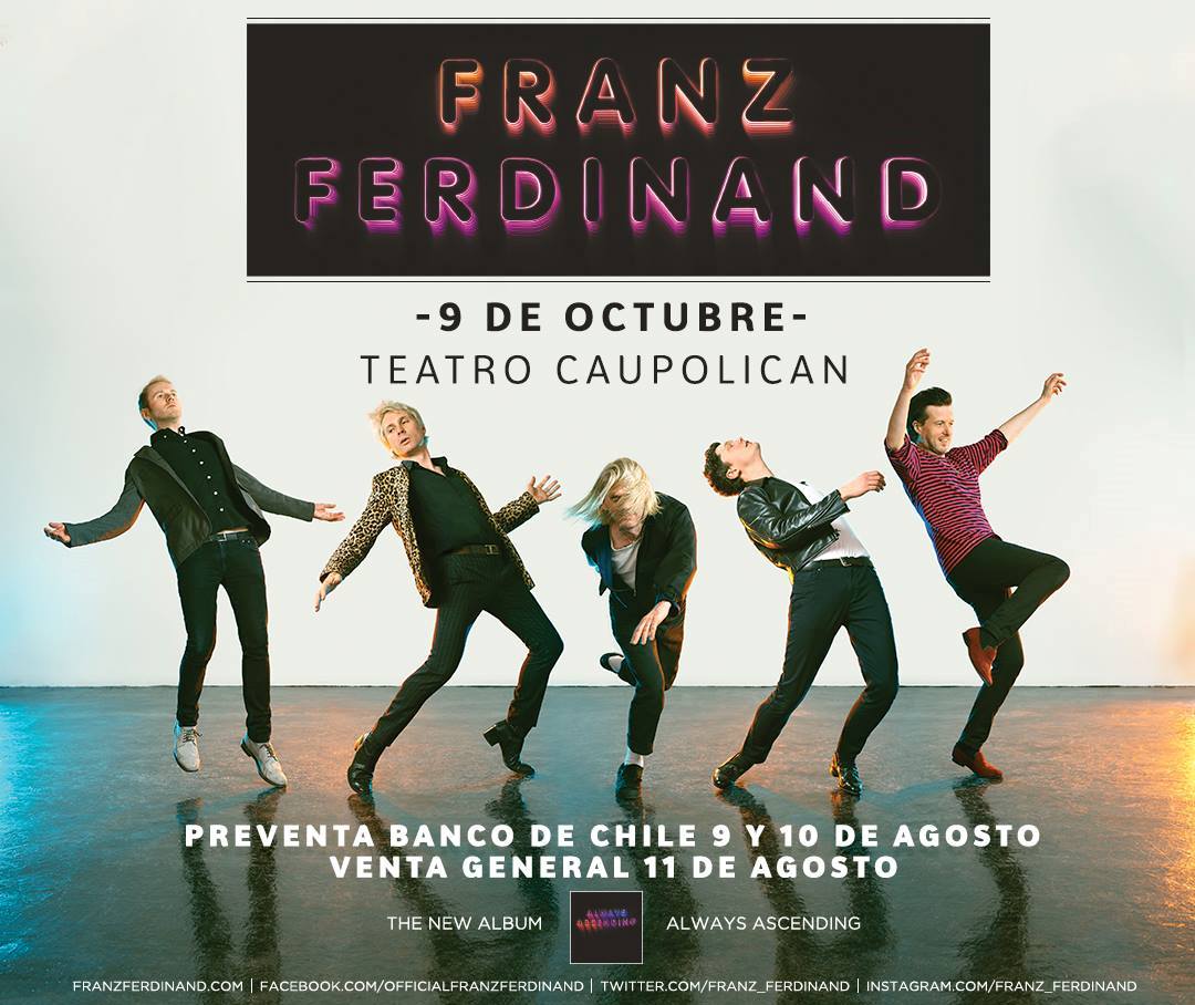 Noticias Franz Ferdinand regresa a Chile – martes 9 de octubre, Teatro Caupolicán Entradas disponibles en Puntoticket. Por Hector Muñoz Tapia | 08 Ago, 2018. 09:45 hrs Entradas disponibles en Puntoticket. Lo había adelantado el propio Alex Kapranos a través de su cuenta de Twitter y hoy finalmente se confirmó: Franz Ferdinand regresa a Chile para dar un show el próximo martes 9 de octubre en el Teatro Caupolicán. Los escoceses volverán con su repertorio de hits y además, para mostrar «Always Ascending», su más reciente disco, lanzado en febrero de 2018. Las entradas estarán disponibles desde el sábado 11 de agosto, mientras que el 9 y 10 del mismo mes habrá una preventa para Clientes Banco Chile, todo a través de Puntoticket. Revisa precios y localidades… Franz Ferdinand Teatro Caupolicán The Guess Who anuncia un nuevo álbum para este año Russ "Satchel" Parrish sacó su nuevo pedal de distorsión "Pussy Melter" Sigue a FUTURO.cl en Google Discover Recibe nuestros contenidos directamente en tu feed. Seguir en Google Contenido patrocinado