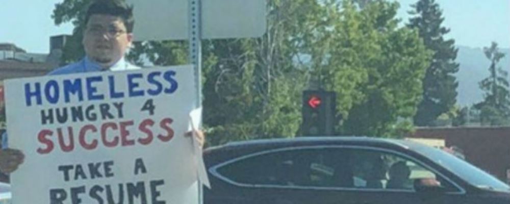 El joven se vistió con traje y corbata, y se paró en un concurrido cruce sosteniendo un cartel con la frase: «Sin hogar. Con hambre de éxito. Toma uno de mis currículums». Y así fue como su historia rápidamente se volvió viral en las redes sociales.