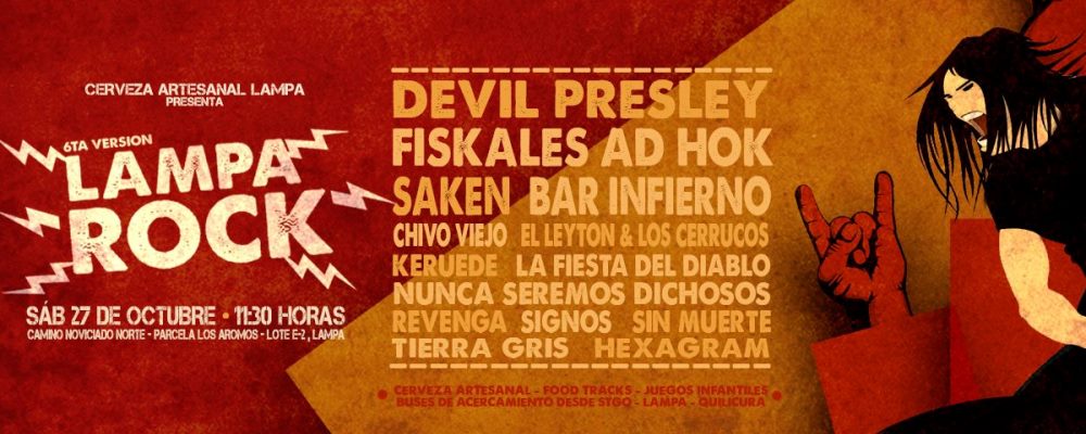Se anunció un encuentro interesante de rock nacional: el festival Lampa Rock 2018, que reunirá a bandas como Fiskales Ad Hok, Devil Presley, Saken y varios otros, el sábado 27 de octubre en la Parcela Los Aromos de Lampa.
