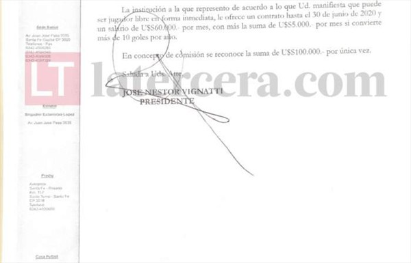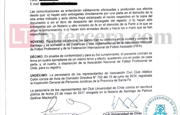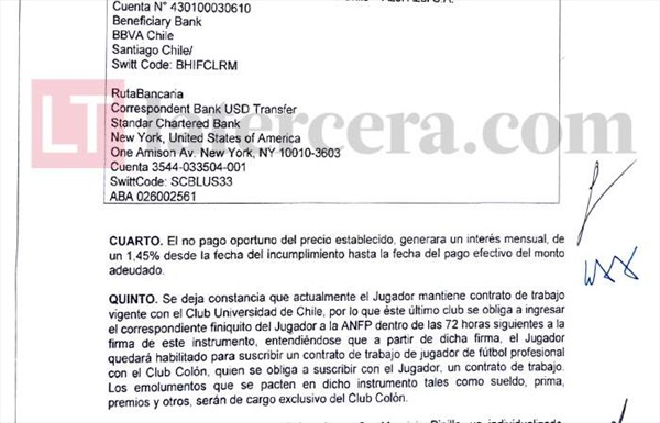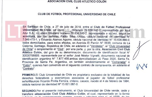 Según filtró La Tercera, el documento de tres carillas cuenta con las firmas de Pinilla, Silva y el presidente de Colón, José Néstor Vignatti, y consigna que el precio del traspaso asciende a la cantidad neta de 100 mil dólares.
