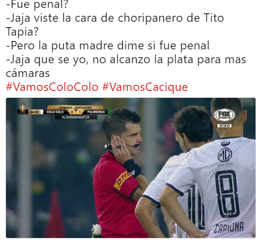 ACTITUD FUTURO ESPECIAL // Los memes de la derrota de Colo Colo ante Palmeiras El Cacique está con un pie afuera de Copa Libertadores, y las redes sociales hicieron eco de la sensible caída para los albos. Por Hector Muñoz Tapia | 20 Sep, 2018. 23:55 hrs El Cacique está con un pie afuera de Copa Libertadores, y las redes sociales hicieron eco de la sensible caída para los albos. Tras la contundente derrota por 2-0 en el Estadio Monumental ante Palmeiras, C0lo Colo está con un pie afuera de Copa Libertadores y está en la obligación de ganar y no recibir goles en el partido de vuelta en Sao Paulo, hazaña posible pero muydifícil. Incluso los hinchas más optimistas no ven con buen futuro las probabilidades de los dirigidos de Héctor Tapia para llegar a semifinales del torneo continental. Por supuesto, apenas terminó el partido, las redes se llenaron de memes sobre la sensible caída para los albos… Los ayudantes del VAR dijeron que no era penal. #VamosCacique pic.twitter.com/XJUDGpG37D — Kent Brockman (@Brockmanewz) 21 de septiembre de 2018 Fui testigo del primer uso del VAR en una cancha de futbol chilena… voy a llorar pic.twitter.com/dsjlXH0duz — curikana! (@liliaemd) 21 de septiembre de 2018 El VAR dice: no es penal. #LibertadoresxFOX pic.twitter.com/SsqAqrHBZ2 — Galo Papá (@bagxxi) 21 de septiembre de 2018 «No hay mano» Dijo el Var sinso#VamosColoColo pic.twitter.com/NrQvDUrPoo — Ignacio Fuentes (@Ignacho_LFC) 21 de septiembre de 2018 #VamosCacique pic.twitter.com/VHdxPN1Lrc — Esteban Valenzuela (@djgatoesteban) 21 de septiembre de 2018 #VamosCacique a devolver el @FOXSports_Chile pic.twitter.com/kQbvwcqNrc — Evertoniano. (@Evertoniano79) 21 de septiembre de 2018 «Colo Colo es Chile» #VamosColoColo#VamosCacique pic.twitter.com/xO7lxb1Iki — Fabián (@Selector__) 21 de septiembre de 2018 CABALLEROS, FUE UN PLACER VER ESTA COPA LIBERTADORES CON USTEDES.#VamosColoColo #vamoscacique pic.twitter.com/3hbW7uDkVG — Ignacio Fuentes (@Ignacho_LFC) 21 de septiembre de 2018 Adivinen quién es? 21 años sin jugar cuartos. Le ponen dos pepas trotando. Y se creen equipo copero.#VamosCacique pic.twitter.com/hejZ06E0mq — Cristian_Alfaro (@Baker_Graffin) 21 de septiembre de 2018 Colo Colo Copa Libertadores memes Palmeiras La velocidad a la que caminas podría predecir si vas a sufrir demencia en los próximos años Colo Colo queda con enorme tarea para avanzar en la Copa Libertadores Sigue a FUTURO.cl en Google Discover Recibe nuestros contenidos directamente en tu feed. Seguir en Google Contenido patrocinado
