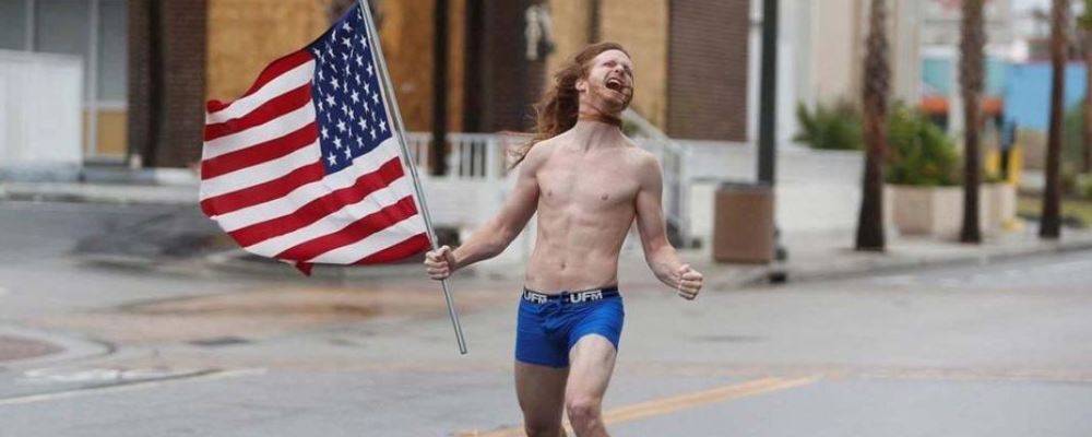 En 2016, en medio de las trormentas provocadas por el huracán Matthew, un «patriota» estadounidense sorprendió con su valentía luego de enfrentarse a los fuertes vientos tan solo en ropa interior, con su larga cabellera al viento y una flameante bandera de Estados Unidos en alto.