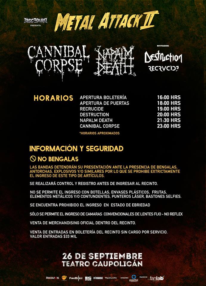 Noticias Metal Attack II revela sus horarios y recomendaciones de seguridad Este miércoles 26 de septiembre es el esperado encuentro con grandes del metal internacional en Santiago. Por Jorge Lagas | 25 Sep, 2018. 17:08 hrs Este miércoles 26 de septiembre es el esperado encuentro con grandes del metal internacional en Santiago. Entramos en cuenta regresiva para el Metal Attack II, el evento que juntará a grandes del metal internacional como Cannibal Corpse, Napalm Death y Destruction, además de los nacionales Recrucide, en el escenario del Teatro Caupolicán, en un encuentro presentado por Disco Duro, el programa del metal en Radio Futuro. La cita es este miércoles y la producción dio a conocer los horarios de la jornada, además de algunas recomendaciones: Últimas entradas disponibles: tiendas Hites, The Knife y boletería. Liberan carteles de "Creed II" que muestran el presente de Rocky Balboa Dave Grohl habla sobre la posibilidad de que Foo Fighters actúe en el Super Bowl Sigue a FUTURO.cl en Google Discover Recibe nuestros contenidos directamente en tu feed. Seguir en Google Contenido patrocinado