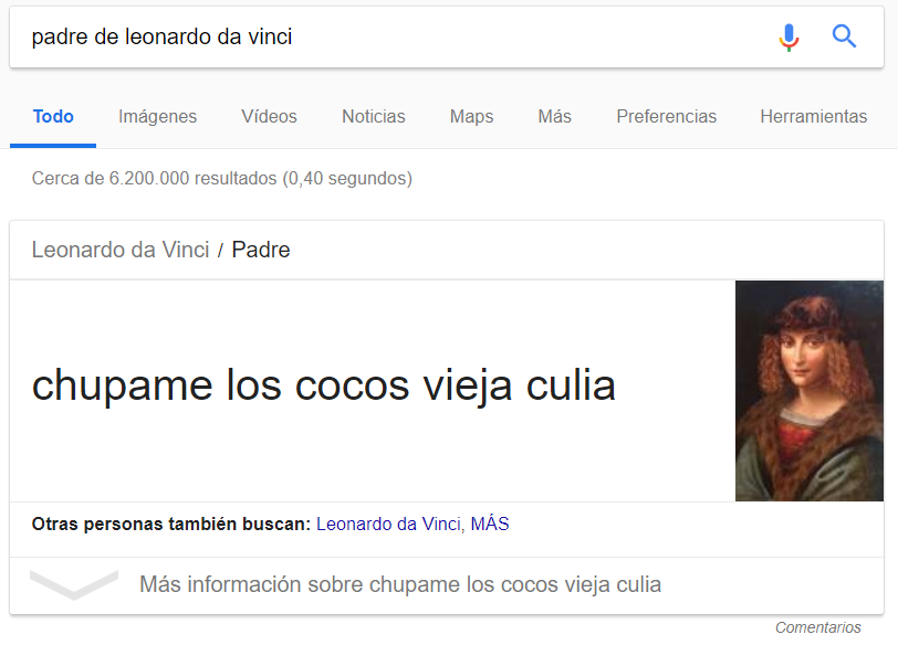 ACTITUD FUTURO «Padre de Leonardo Da Vinci»: Revisa el chilenísimo viral que saca carcajadas en redes sociales Hoy, en la sección "típico chileno". Por Hector Muñoz Tapia | 24 Sep, 2018. 08:56 hrs Hoy, en la sección «típico chileno». En las últimas horas, buscar información en internet sobre el padre del célebre artista Leonardo Da Vinci pasó de ser una acción para saber más sobre cultura general a una excusa para reírse a carcajadas por un ingenioso y “chilensis” trolleo. Esto porque al googlear las palabras “padre de Leonardo Da Vinci” aparecerá una peculiar y picarezca respuesta que pueden ver a continuación: La razón se debe a que un chileno (típico) cambió la biografía de Wikipedia de Piero Fruosino Di Antonio Da Vinci, nombre real del progenitor de Leonardo, la cual no ha sido cambiada hasta el momento. Leonardo Da Vinci Trabajadores del aeropuerto luchan al estilo "Star Wars" en plena pista y la rompen en las redes sociales Jimmy Bennett rompió el silencio: "Sí, Asia Argento me violó" Sigue a FUTURO.cl en Google Discover Recibe nuestros contenidos directamente en tu feed. Seguir en Google Contenido patrocinado