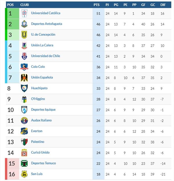 ACTITUD FUTURO Así queda la tabla de posiciones a seis fechas del final del campeonato nacional Universidad Católica se escapó en el liderato a cinco puntos de sus principales escoltas. El descenso quedó al rojo vivo. Por Hector Muñoz Tapia | 01 Oct, 2018. 07:06 hrs Universidad Católica se escapó en el liderato a cinco puntos de sus principales escoltas. El descenso quedó al rojo vivo. A sólo seis fechas del final, el campeonato nacional ya tiene un líder exclusivo: Universidad Católica. Tras batir a Colo Colo en el clásico, el conjunto cruzado se encaramó a cinco puntos de sus principales escoltas, Deportes Antofagasta y Universidad de Concepción. La pelea por clasificar a torneos internacionales también quedó cerrada, mientras que el descenso quedó al rojo vivo. Revisa la tabla de posiciones a continuación. Campeonato Nacional Evo Morales agradeció respaldo de Florcita Alarcón a horas del fallo de La Haya Palabra de Capitán América: Chris Evans arremete contra Kanye West por su apoyo a Donald Trump Sigue a FUTURO.cl en Google Discover Recibe nuestros contenidos directamente en tu feed. Seguir en Google Contenido patrocinado