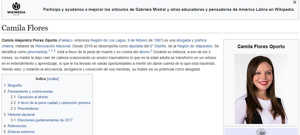 Luego de la polémica generada por la diputada pinochetista Camila Flores, tras decir en el Programa Mentiras Verdaderas que la Brigada Ramona Parra asesinó gente en la Unidad Popular, hoy apareció modificado su perfil en Wikipedia.