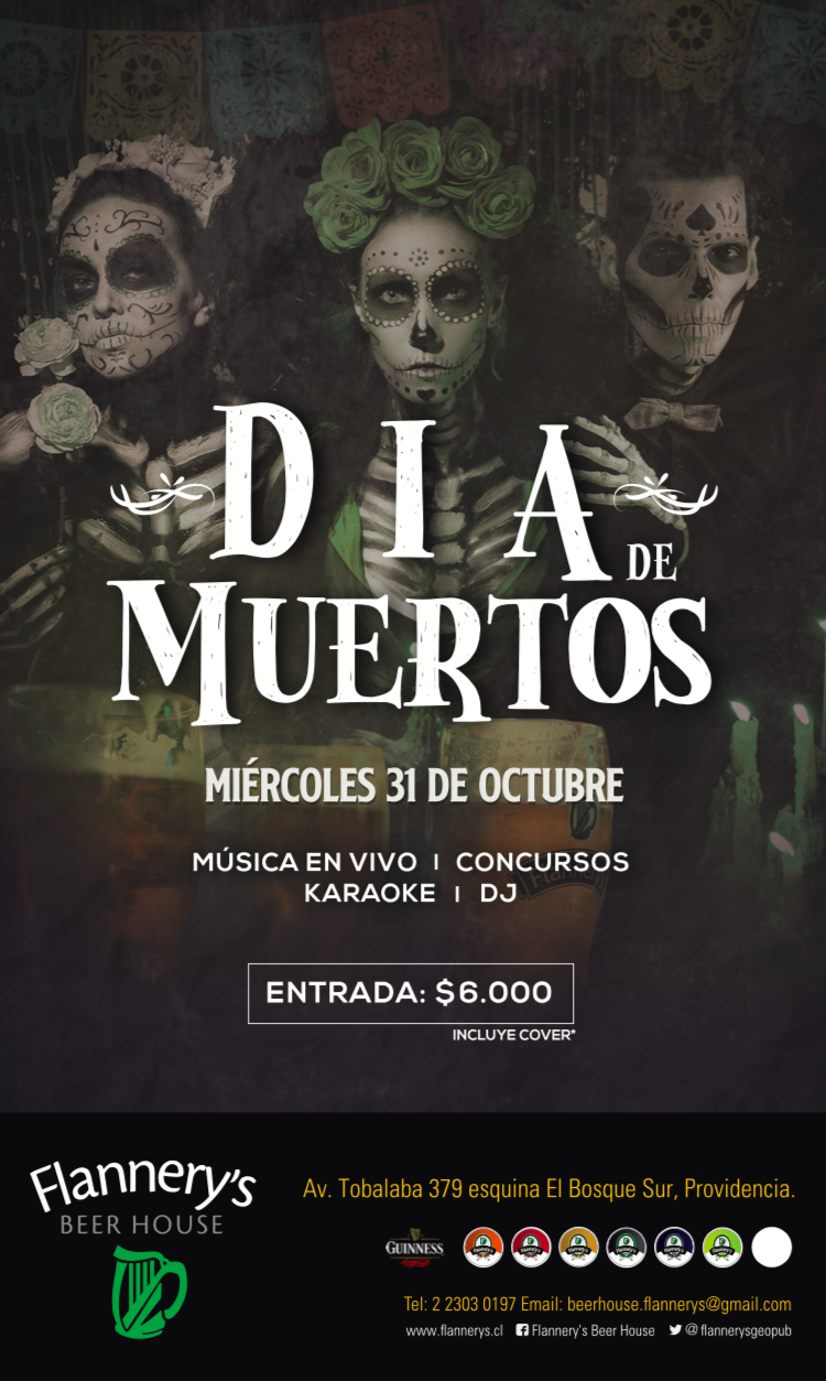 Por otro lado, Flannery’s Beer House tendrá su Día de Muertos desde las 20:00 con música en vivo, concursos y premios a los mejores disfraces, además de karaoke y DJ. La entrada tiene un valor de $6.000 que incluye promociones y sorpresas paranormales en Tobalaba 379, Providencia.