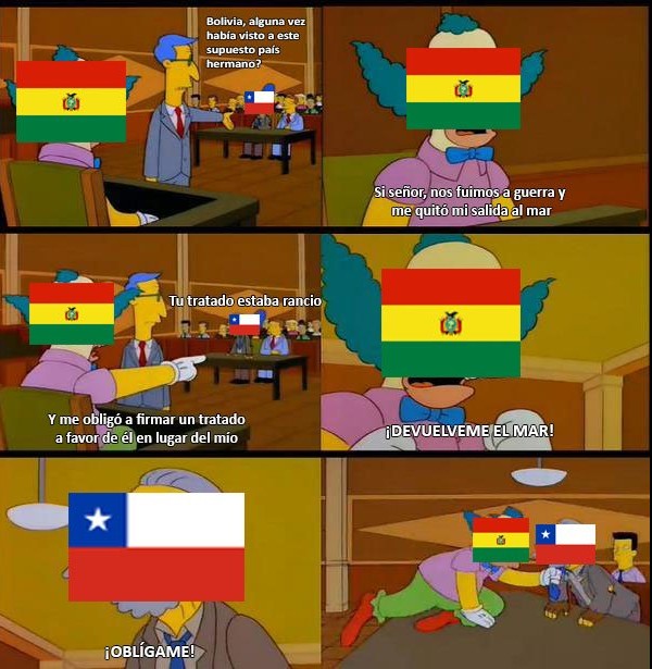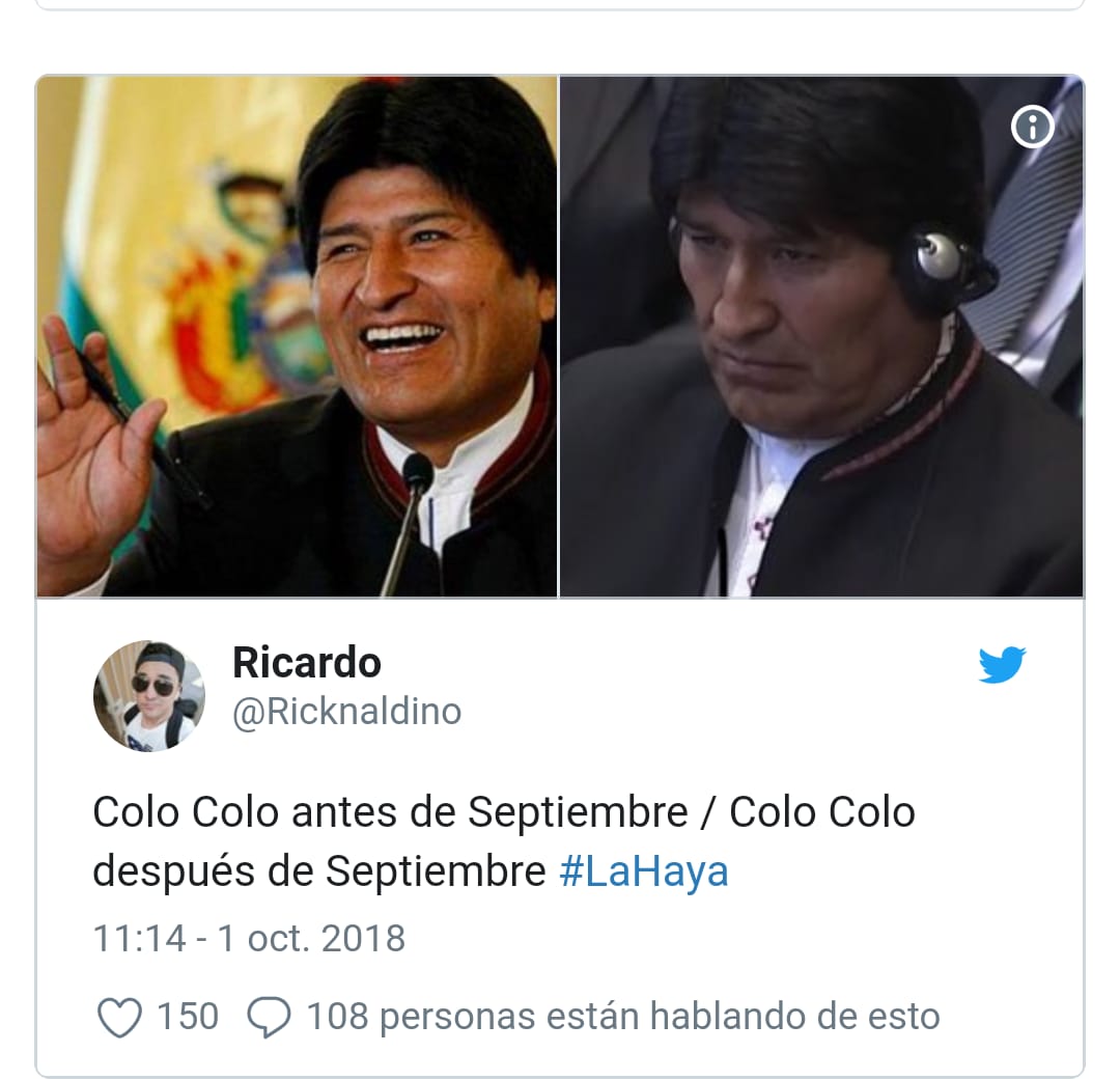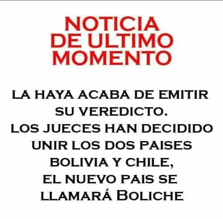 ACTITUD FUTURO ESPECIAL // Los memes por el fallo de La Haya En redes sociales no se hicieron esperar los comentarios graciosos por la histórica instancia a favor de Chile. Por Hector Muñoz Tapia | 01 Oct, 2018. 11:48 hrs En redes sociales no se hicieron esperar los comentarios graciosos por la histórica instancia a favor de Chile. Tras la resolución de La Haya de desestimar la obligatoriedad contra Chile para negociar con Bolivia, las redes sociales se llenaron de comentarios e imágenes alusivas al histórico fallo a favor de nuestro país. Y, por supeusto, muchas de estas tuvieron como principal foco al presidente altiplánico, Evo Morales, puesto que ha sido este tema uno de los mayores argumentos al momento de elaborar su discurso. Revisa los mejores a continuación… Querían sentarse a negociar jajajajajajaja #LaHaya #Chile pic.twitter.com/d5FwtDCziy — Gabi Gonzalez (@gonzalezgabi60) October 1, 2018 #LaHaya MAÑANA FERIADOOOOOOOOOOO — Sebastián Sáez M. (@ElGatoSaez) October 1, 2018 ¿Estos puntos sirven para clasificar al Mundial de Qatar? #LaHaya pic.twitter.com/IC0XJMm5j0 — Guatón Zabatman (@zabatman) October 1, 2018 Vamos a plaza Italia? #LaHaya — Christian Chamorro (@randudog) October 1, 2018 Ya feriado nacional!!!! #LaHaya pic.twitter.com/lQqIkJObgP — Trapitos (@TrapitosGamer) October 1, 2018 12 votos contra 3 CIJ rechaza demanda de Bolivia. Chile NO tiene obligación de negociar. Chile gana en La Haya.🇨🇱🇨🇱🇨🇱#LaHaya — Alejandra Smith (@SmithAlejandra) October 1, 2018 #LaHaya ganamos !!!!! Viva chile 🇨🇱 pic.twitter.com/I9SglipbCG — NO mas maltrato animal 😡😘🐶 (@alenicol3) October 1, 2018 GANAMOS FALLO. Chile no está obligado por la corte a negociar con Bolivia, disposición que refuerza nuestra soberanía. #LaHaya — Patricio Bopp (@pboppt) October 1, 2018 #LaHaya pic.twitter.com/EeDqoOKqgn — Javiera🌻 (@SplashhJavi) October 1, 2018 #LaHaya pic.twitter.com/OuJwIrixHP — Pancho Alarcón (@flacopancho) October 1, 2018 Evo Morales ql #LaHaya 😂😂😂 pic.twitter.com/RsLpTDXWWu — cristian griffin (@griffin_mora) October 1, 2018 #LaHaya ¡¡VENDO TABLITA BARATA PUIS!!! pic.twitter.com/jTuZHuuAqL — Miquele (@miqueleru) October 1, 2018 #LaHaya #Bolivia #Chile #ElFalloFinal pic.twitter.com/bnnLjtP0KV — Francisco Javier (@fcojavi_silva) October 1, 2018 #LaHaya #Chile #Bolivia #EvoMorales pic.twitter.com/3peBQqLTwb — EduAlbo (@EduSeversonIII) October 1, 2018 #LaHaya #CooperativaEnLaHaya #FalloCNNCHV #FalloLaHayaAN y asi en palabras simples al fallo de la Haya. pic.twitter.com/VrXS3aS2KL — Alexis Padilla (@DjDaiiihhzzx) October 1, 2018 Alexis haz lo tuyo #LaHaya pic.twitter.com/zqshz06yT4 — DEATH SCYTHE (@ElArkano13) October 1, 2018 Tranquilo Evo, no pesque el fallo, yo le tengo la solución#LaHaya pic.twitter.com/TKUHI5Dp54 — El Tetera (@eltetera) October 1, 2018 #LaHaya @evoespueblo Paliza pic.twitter.com/3Rrz97DA7s — Carlos C Grez (@carloscgrez) October 1, 2018 #LaHaya pic.twitter.com/6pgJqiVej4 — Kary ✨⚡️ (@kellyduff3) October 1, 2018 Tranquilo @evoespueblo, seguro que se te ocurre algo para demandar en #LaHaya a alguien (incluso de nuevo a Chile) para tirar balones fuera y seguir agarrado en el sillón presidencial sin centrarte en los problemas que tienes en casa. pic.twitter.com/3F5vepaMo2 — Bufi (@Bufigol) October 1, 2018 La Haya Korn lanza su propia marca de café Revisa el cover de "Purple Haze" por Red Hot Chili Peppers Sigue a FUTURO.cl en Google Discover Recibe nuestros contenidos directamente en tu feed. Seguir en Google Contenido patrocinado