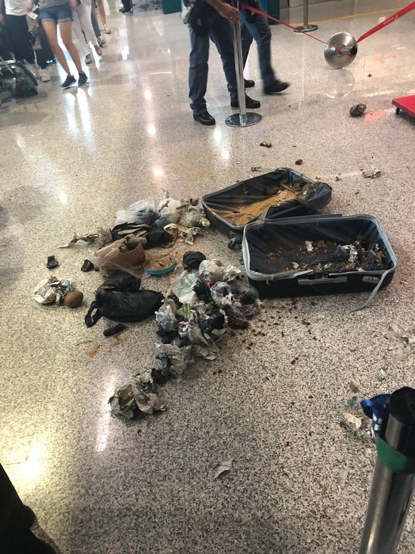 Donovan tomó fotografías mostrando el interior de la maleta destrozada. Continuó: «Aquí hay una foto momentos después de que los cocos sospechosos explotaran».