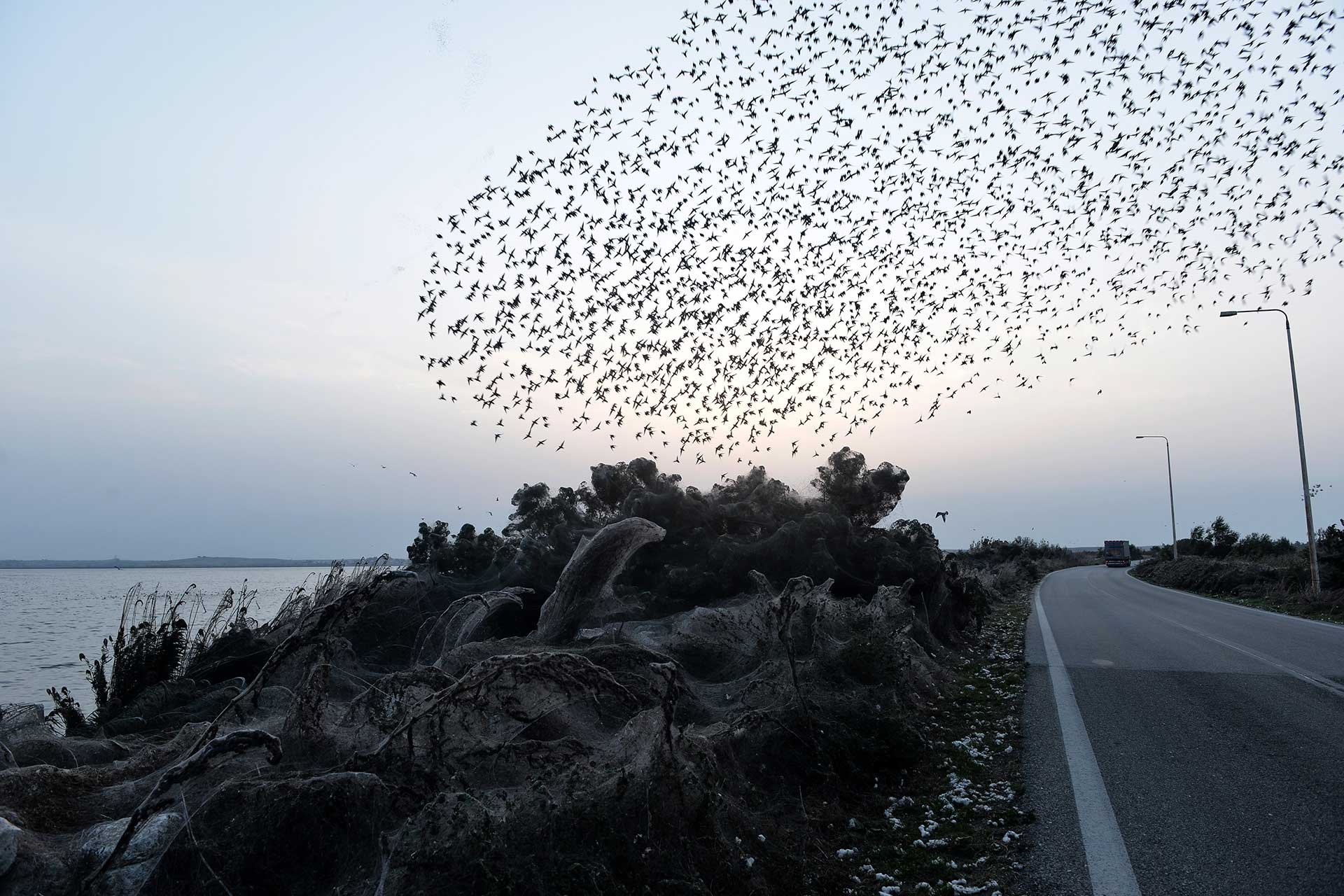 Una gran telaraña ha cubierto 10.000 metros cuadrados de ribera en un pueblo junto al lago Vistonida, en el norte de Grecia, después de que hace un mes un fenómeno similar en otra zona del país se hiciera viral en todo el mundo.